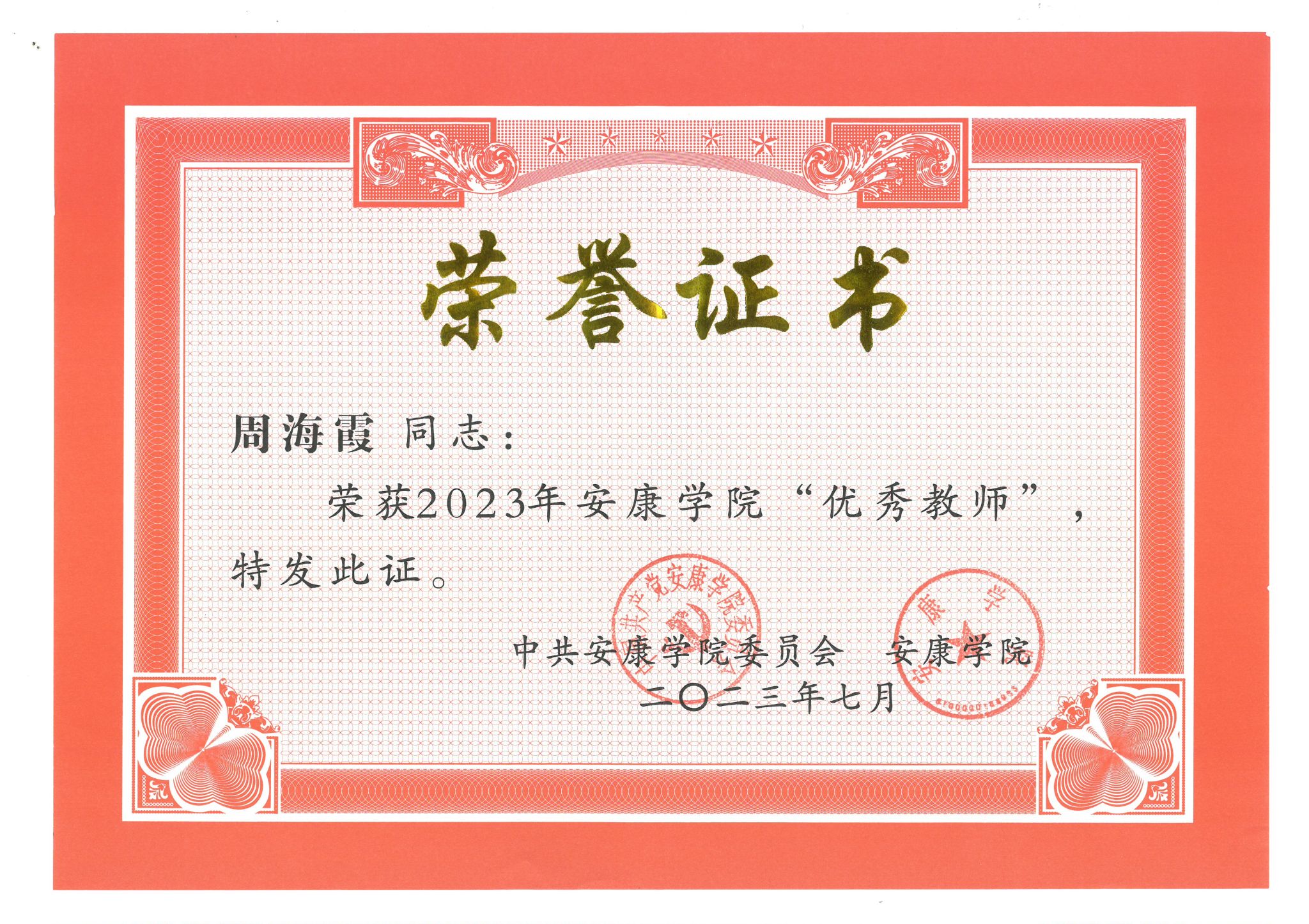 根据《关于推荐评选安康市教育工作先进集体和优秀教师、师德标兵、优秀班主任、先进教育工作者的通知》(安评组办发〔2023〕5号)精神和《公司关于开展2023年校级教职工荣誉评选工作的通知》(党政办发〔2023〕16 号)相关要求,经个人申报、学校组织专家评审,公司教师周海霞被评为太阳成tyc122cc集团优秀教师,同时被推荐参评安康市优秀教师,经安康市评审,确定周海霞为2023年安康市优秀教师。