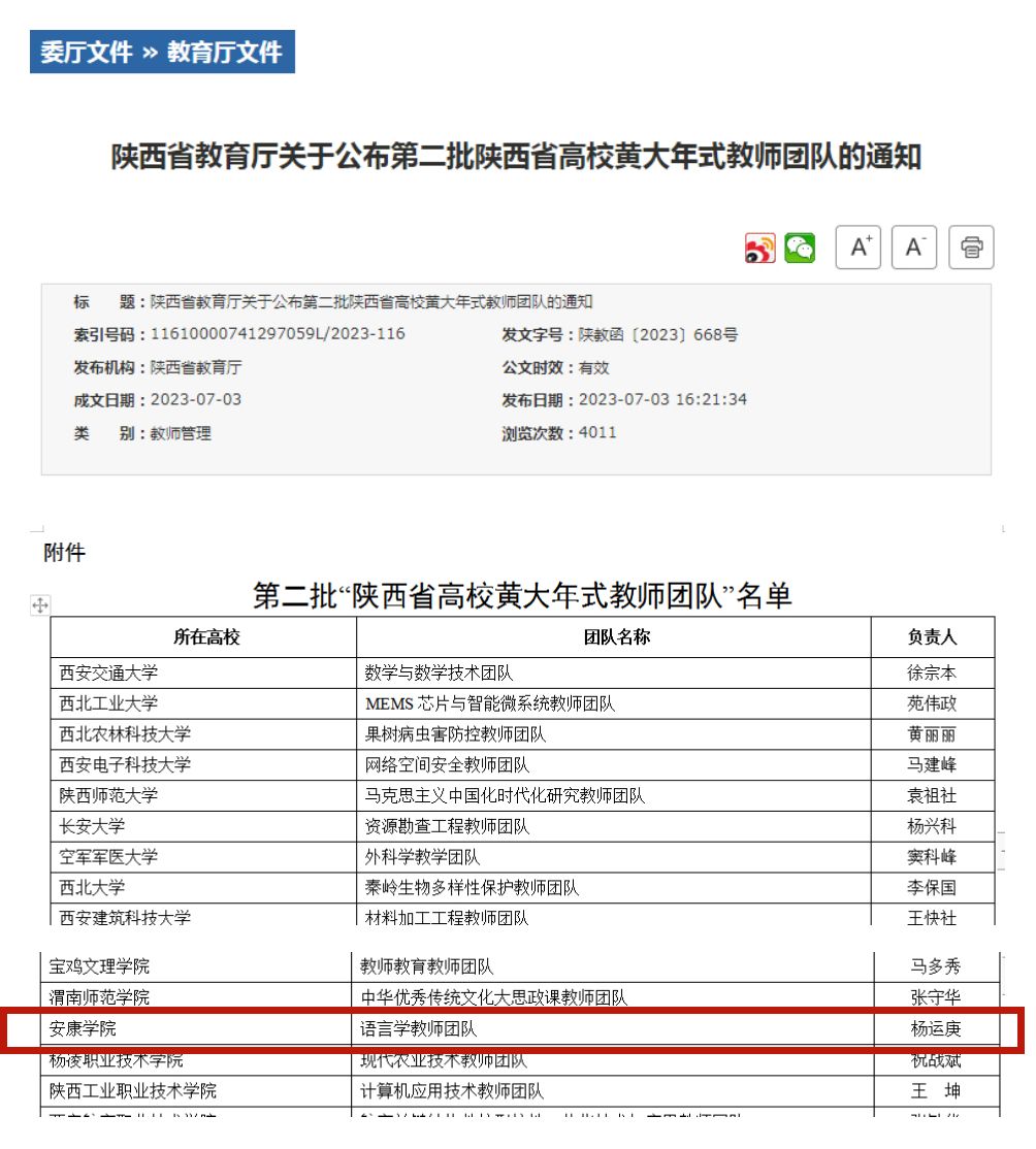 7月3日,根据陕西省教育厅印发的《陕西省教育厅关于公布第二批陕西省高校黄大年式教师团队的通知》(陕教函〔2023〕668号),公司杨运庚教授牵头申报的“太阳成tyc122cc集团语言学教师团队”荣获第二批陕西省高校黄大年式教师团队创建项目。