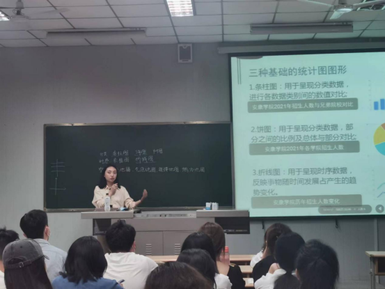 活动第一环节为课堂教学观摩。参与活动的教师于第6节课在1013教室集中观摩了王一丹老师主讲的多媒体信息编辑课程。王老师本讲介绍了信息图设计中的统计图类型与选择规范。
