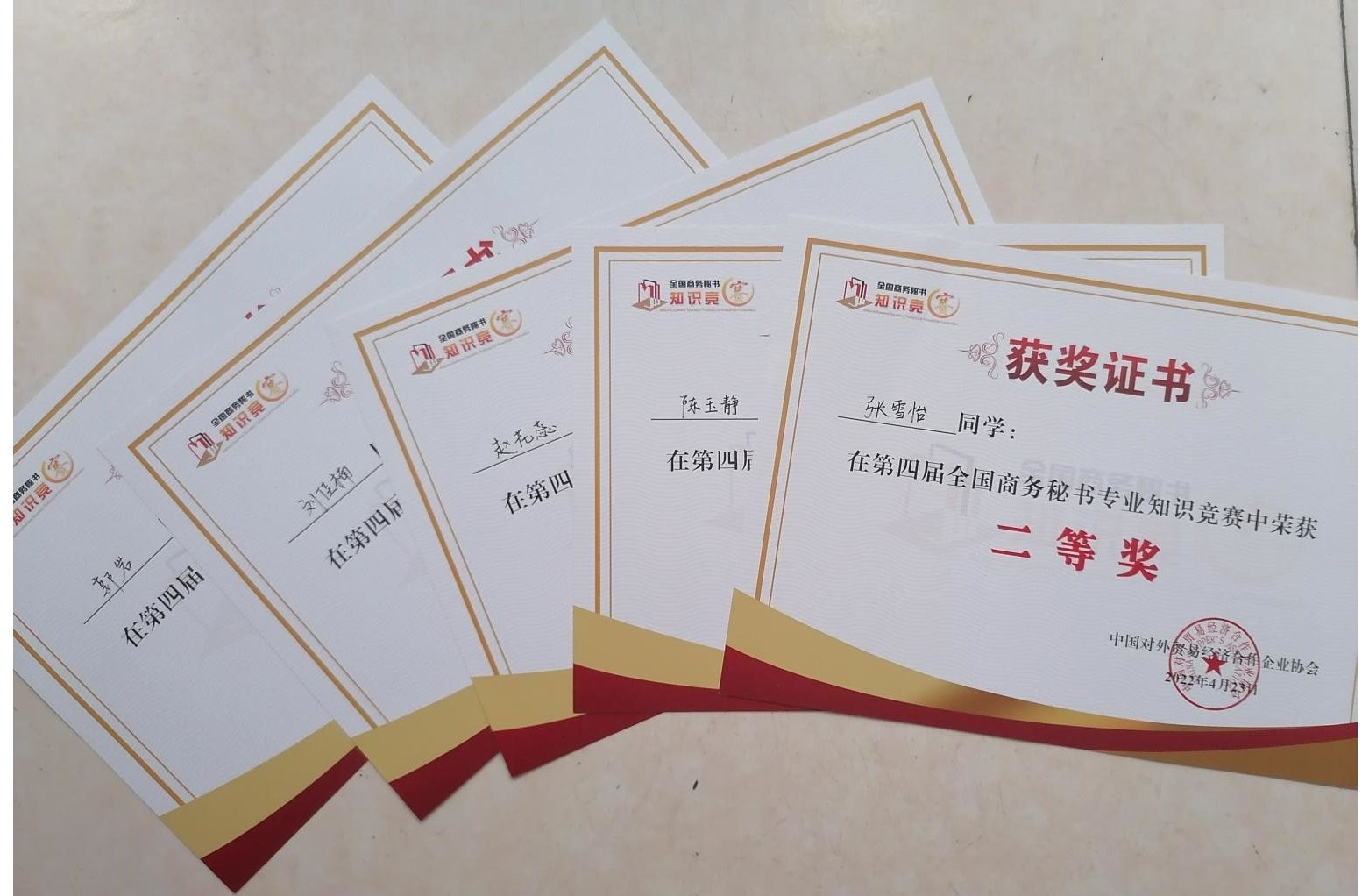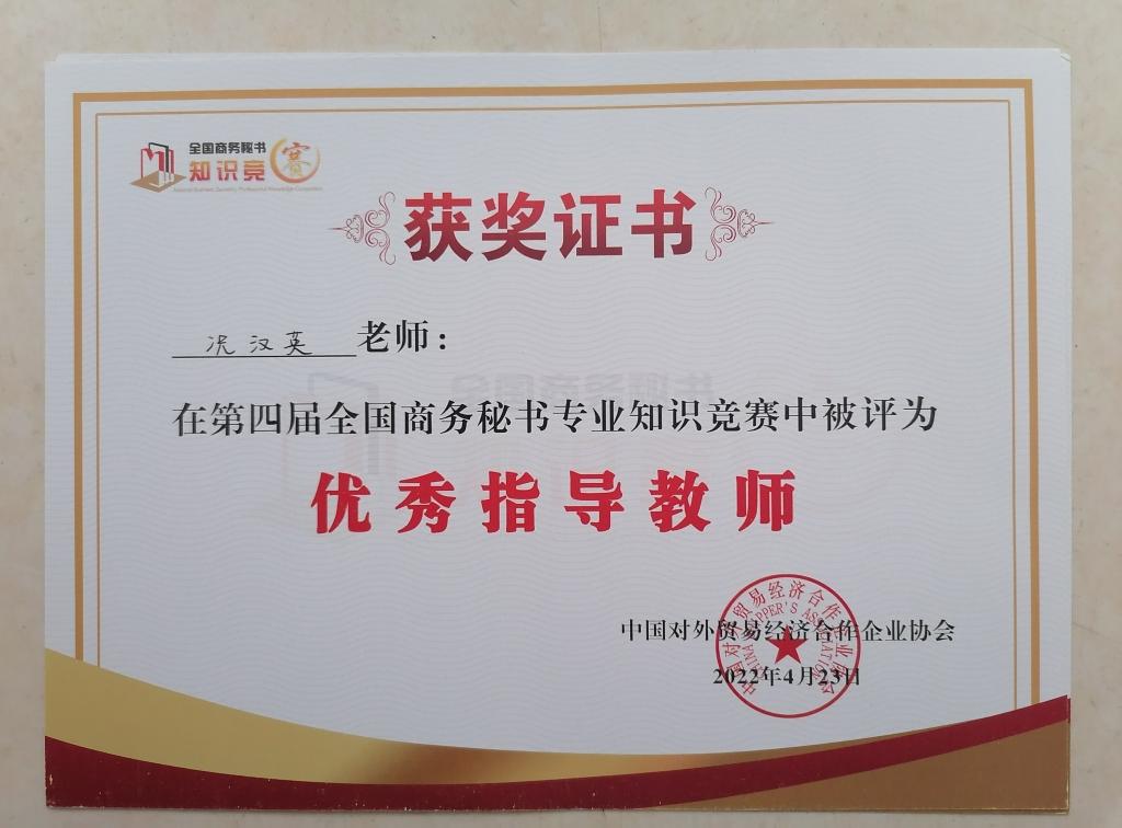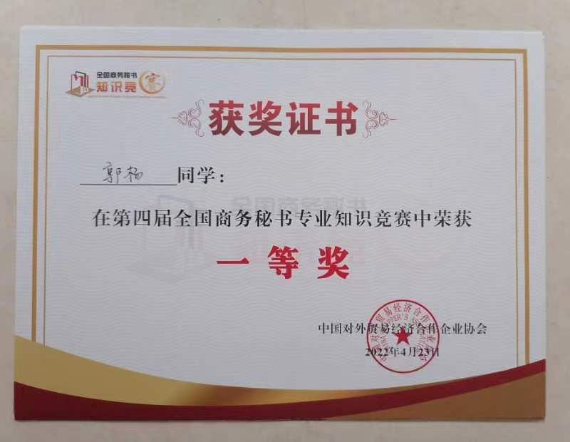 2022年4月23日,公司秘书学专业员工参加了“第四届全国商务秘书专业知识竞赛”,再创佳绩。郭杨同学获竞赛一等奖,张雪怡、陈玉静、赵花蕊、刘佳楠、郭岩5名同学获竞赛二等奖,佘海茹、唐磊、赵龙洋、杨豪苗等17名同学获竞赛三等奖,耿世杰、王米娜等11名同学通过资格认定获“高级商务秘书证书,太阳成tyc122cc集团获竞赛“优秀组织奖”,况汉英老师获“优秀指导教师”。