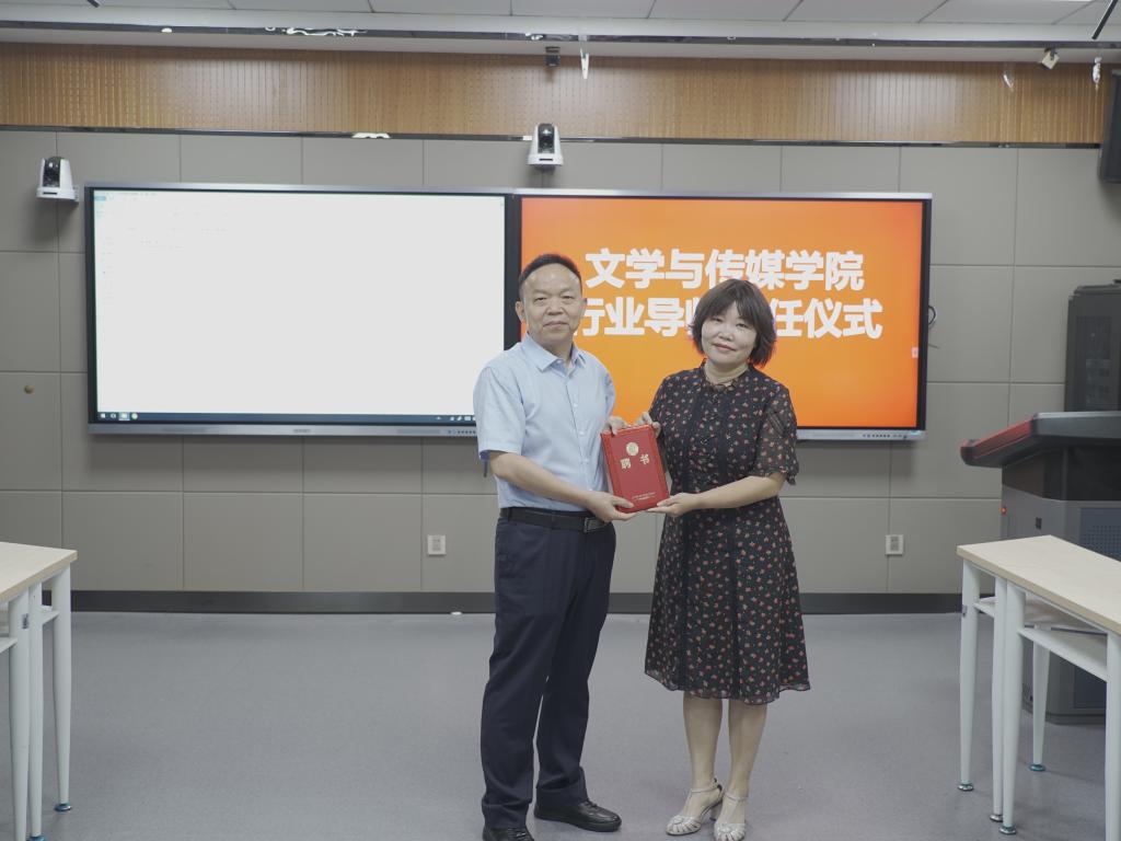 杨运庚为童慧、郭飒颁发行业导师证书并感谢两位导师对网络与新媒体专业人才培养的大力支持。