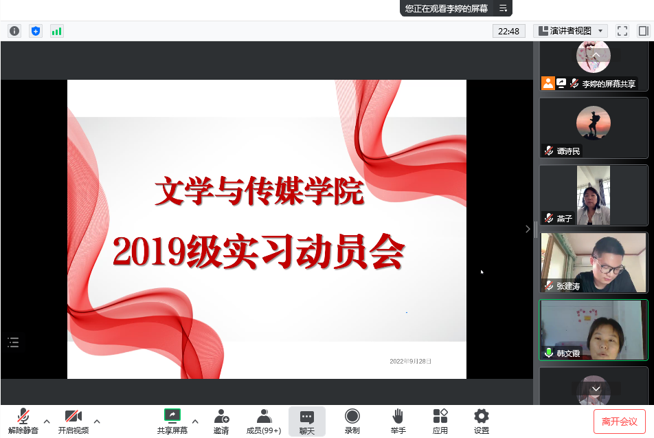 为进一步做好2019级实习工作,9月28日下午,太阳成tyc122cc集团通过腾讯会议平台召开2019级实习动员会。公司教学副经理李婷、汉语言文学系主任韩文霞、秘书与新媒体系主任谭诗民、秘书与新媒体系副主任张建涛、学院教学秘书张燕以及2019级全体员工参加会议。