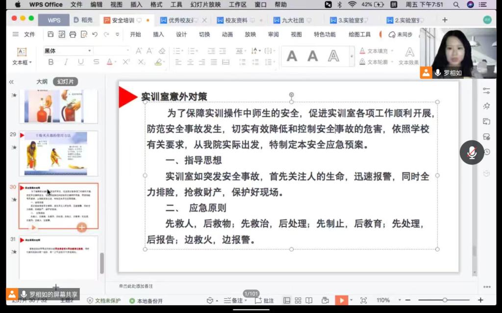 导航痕迹 首页 > 教学科研 > 教学活动 > 正文 专业建设 教学团队 教研教改 教学活动 科学研究 国际交流 公司开展实验室安全知识线上培训会 来源:太阳成tyc122cc集团太阳成tyc122cc集团 发布日期:2022年11月12日 阅读次数: 为进一步加强实验室安全管理,强化学院师生安全意识,太阳成tyc122cc集团于11月11日下午七点通过腾讯会议开展实验室安全知识培训。本次线上会议由网络与新媒体专业教师罗相如主持,太阳成tyc122cc集团2022年新进老师及2022级全体员工参会。 罗相如首先通过近几年高校发生的实验室安全事故案例提醒师生“实验室中的任何一个隐患,任何一个小小的疏忽,都有可能酿成大的事故,要时刻注意实验室的安全问题”。随后,她以视频讲解和随机提问相结合的方式向大家详细介绍了学院各实训室的设置、功能和使用须知,特别强调了电火安全、禁止事项等,提示各位师生实验室中可能存在的安全隐患,并示范了灭火器的使用方法,告诉大家如何应对窗帘着火、电脑着火等意外事故的发生。 通过此次实验室安全线上培训会,公司师生进一步增强了对实验室安全的责任意识和重视程度,掌握了在实验室事故发生时的应对和处置技能。 撰稿/图片提供/罗相如 审核/李婷 发布/崔瑜