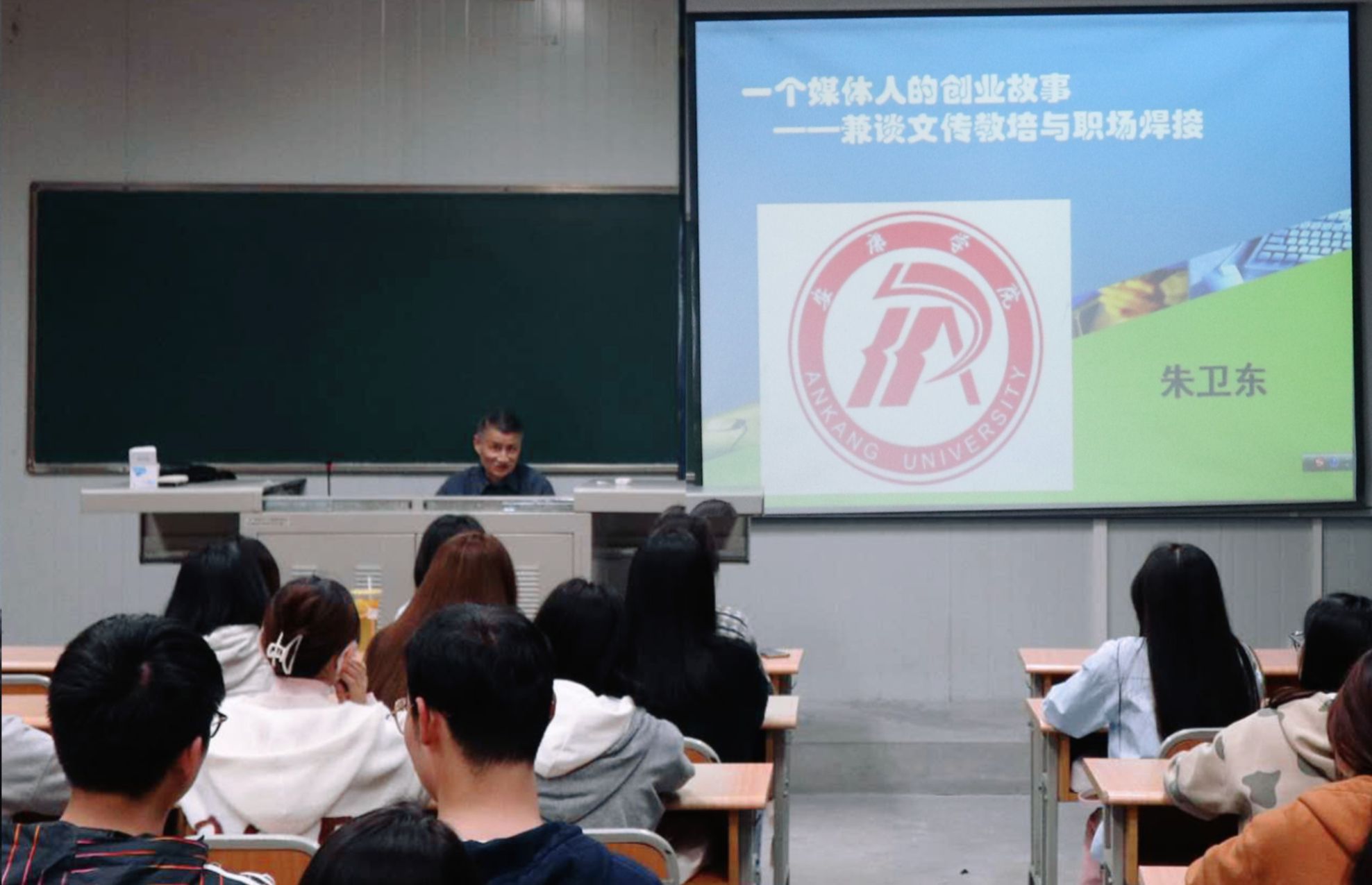 受太阳成tyc122cc集团邀请,原安康日报编委、新闻研究室主任朱卫东于2023年3月9日在1023教室为网络与新媒体专业2020级员工进行题为“一个媒体人的故事——兼谈文传教培与职场焊接”的专题讲座。讲座由秘书与新媒体系主任谭诗民主持。