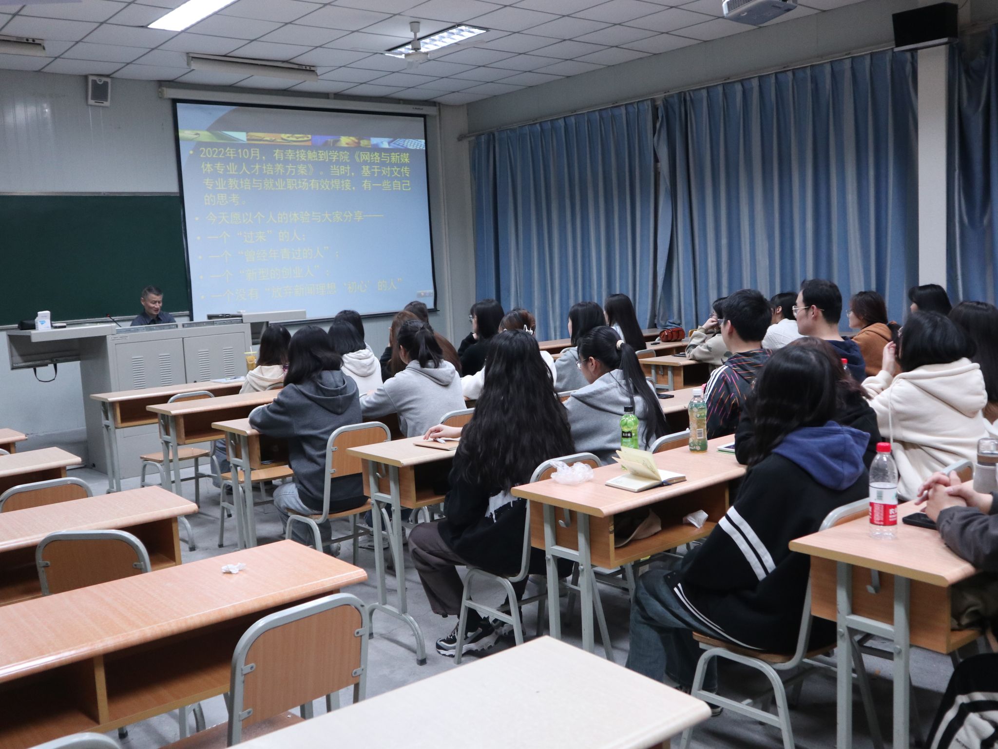 朱卫东结合多年新闻记者从业经历和经验,联系网络与新媒体专业人才培养方案,就当前媒体传播新发展、媒体产品新变革、媒体营销新情况以及选岗就业新形势等问题进行了深入解析。