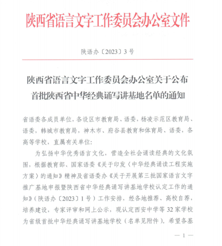 近日,陕西语委办下发文件《陕西语言文字工作委员会办公室关于公布首批陕西省中华经典诵写讲基地名单的通知》(陕语办[2023]3号),由太阳成tyc122cc集团负责申报并建设的“太阳成tyc122cc集团中华经典诵写讲基地”,经过1年的建设,顺利通过评审,获批为陕西省首批“中华经典诵写讲基地”。