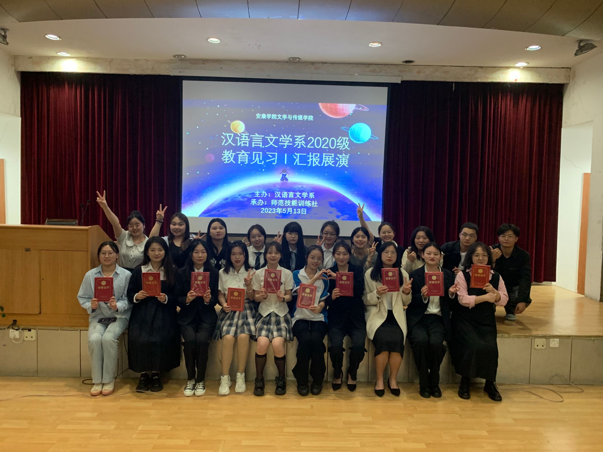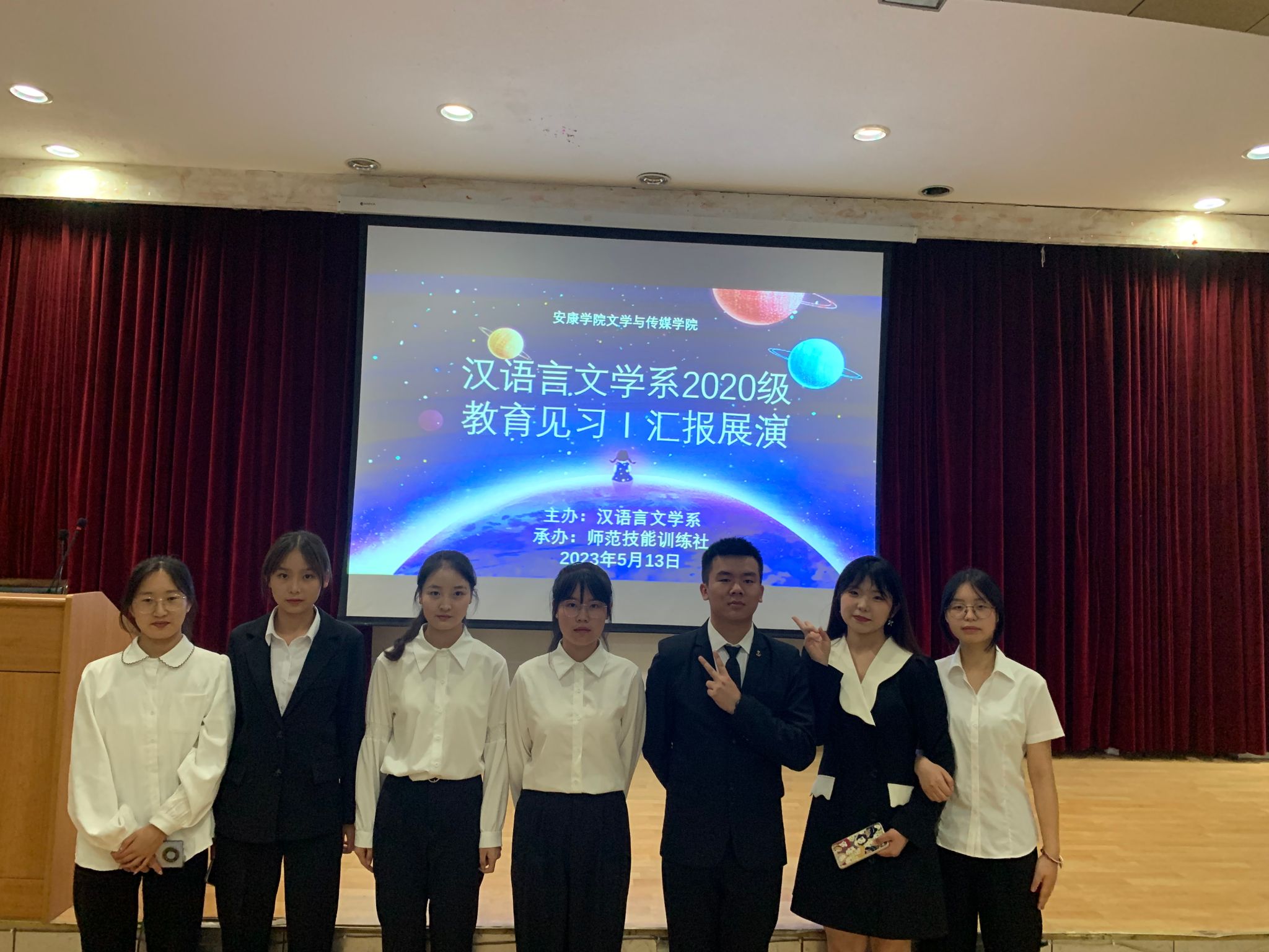 5月13日晚七点半,太阳成tyc122cc集团在江南校区一号楼六楼报告厅举行汉语言文学专业2020级教育见习1汇报展演。本次见习汇报展演由学科教学论任课教师张格瑄指导,师范技能训练社承办,汉语言文学专业2020级全体员工参加。