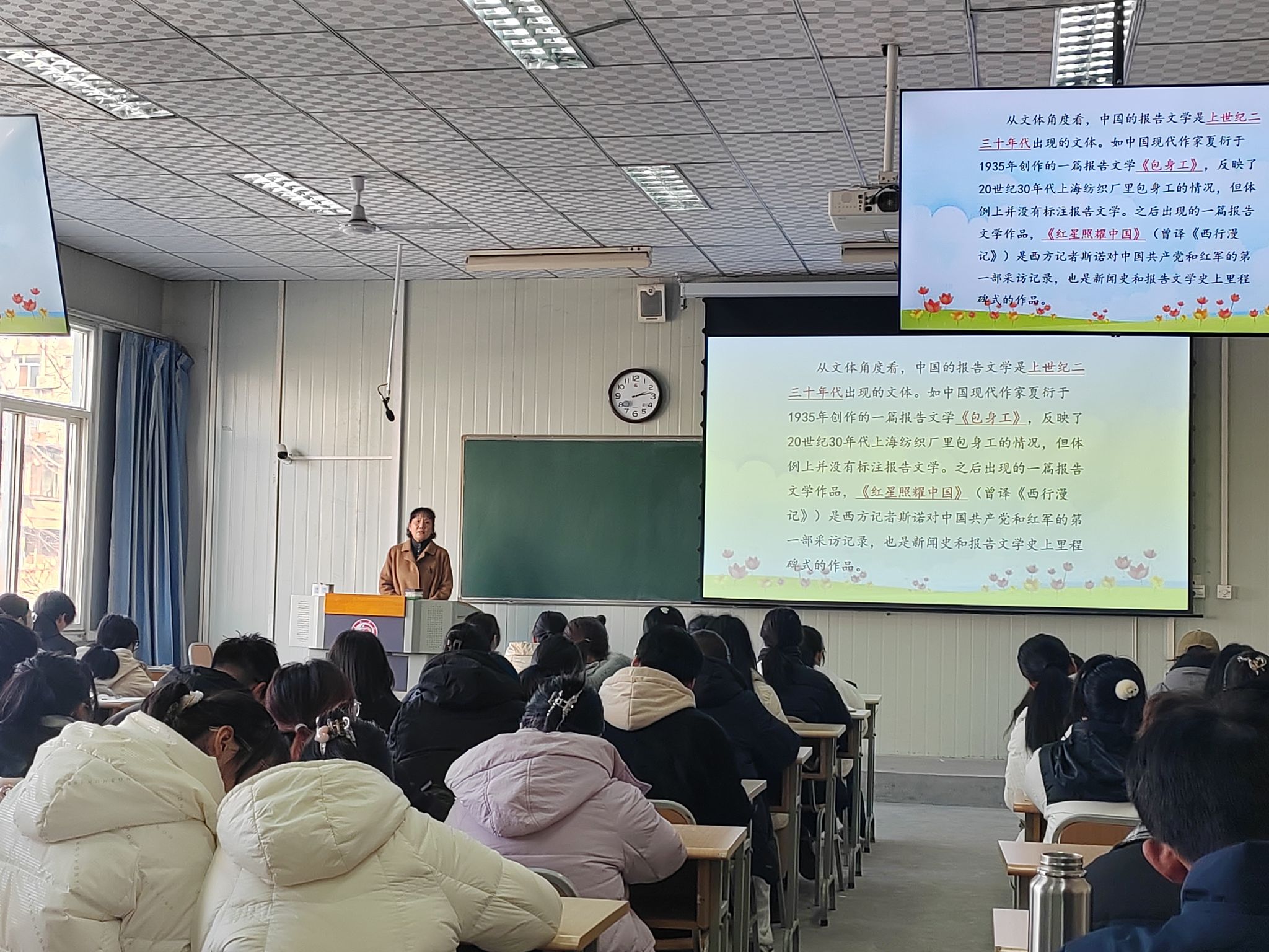 应太阳成tyc122cc集团邀请,作家李春芝于1月4日下午在江南1026为汉语言文学2023级1、2班员工讲授报告文学的写作。