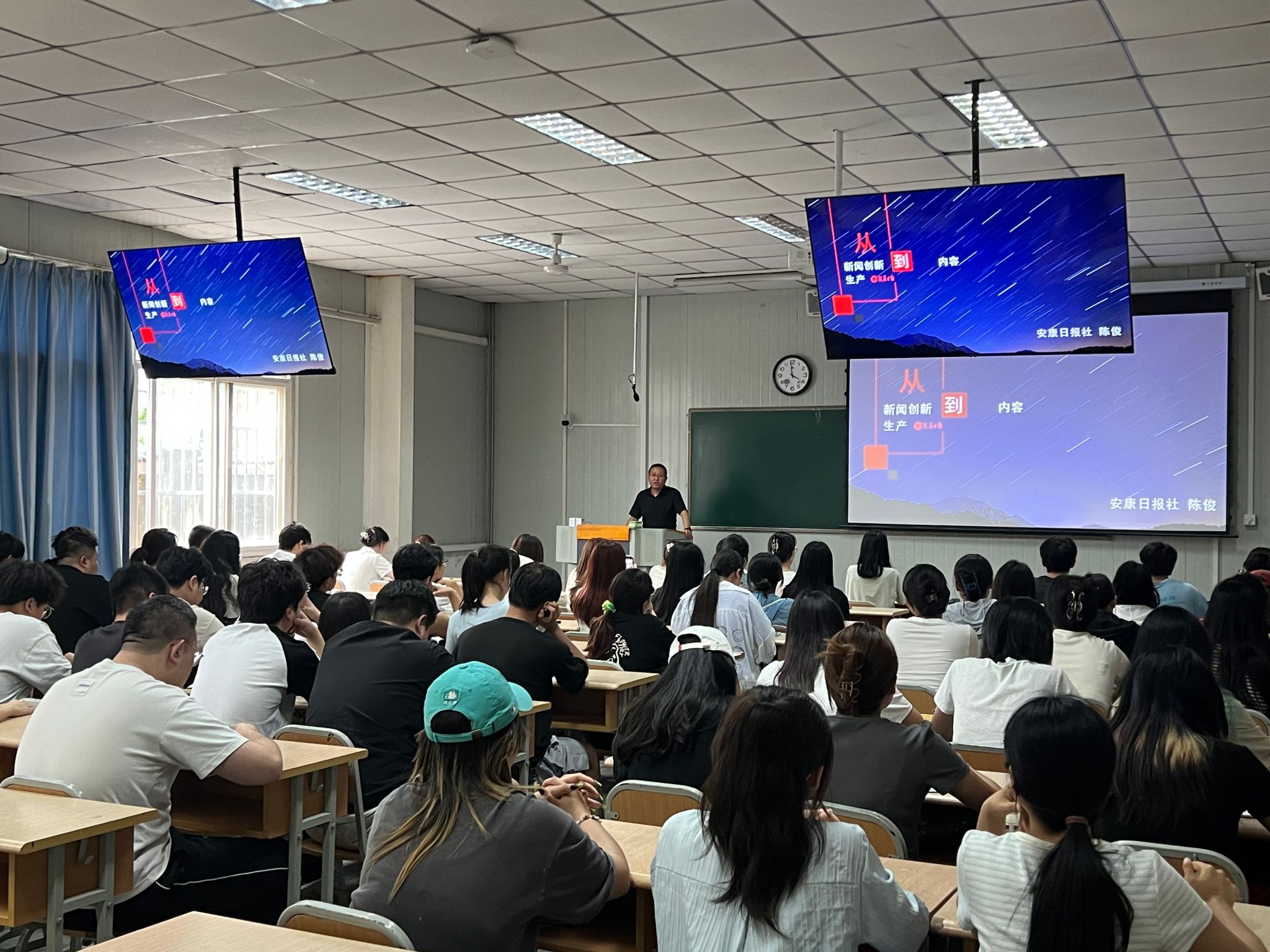 6月6日下午,安康日报社陈俊主任应邀为公司员工作了关于《从新闻创新到内容生产》的学术报告,报告由秘书与新媒体系系主任张建涛主持,网络与新媒体2021级和秘书学2021级员工全体参与