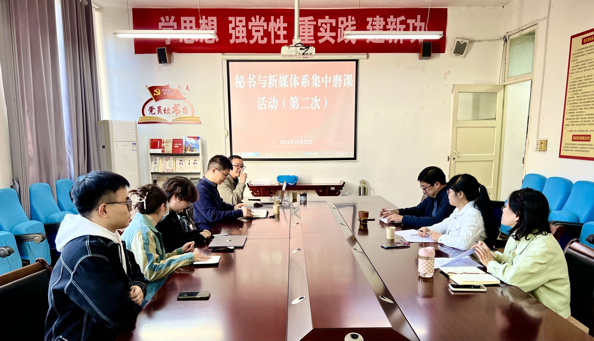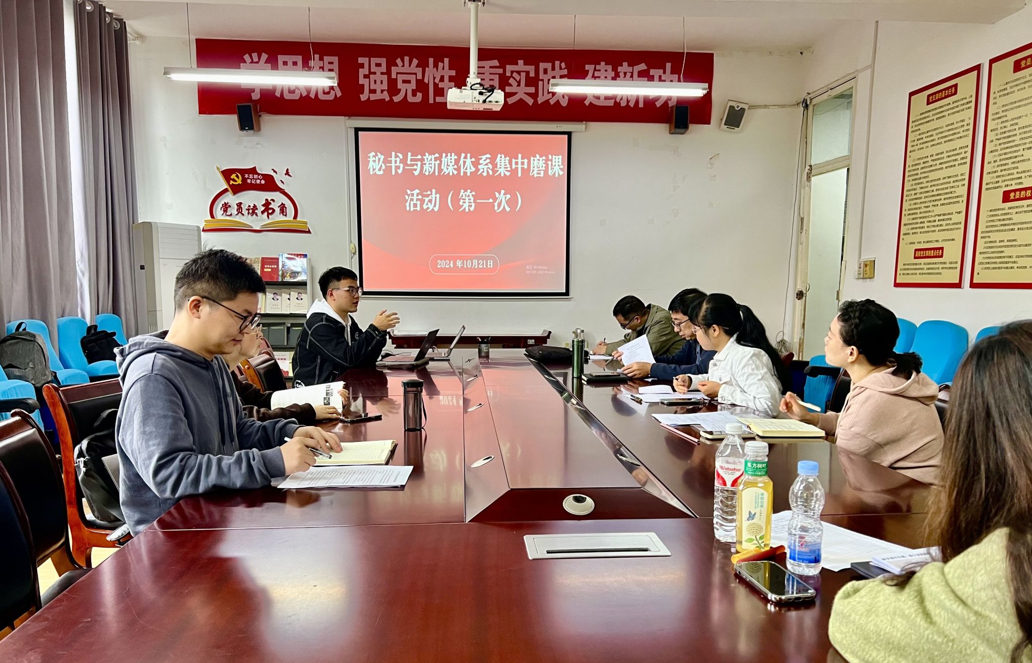 帮助教师提升课堂教学水平按照学院统一安排,秘书与新媒体系10月21-22日在2307会议室组织举办了磨课教研活动。活动邀请孙鸿、崔瑜两位教学督导以及曹刚副经理全程参与指导由系主任张建涛主持,秘书与新媒体系全体教师参与