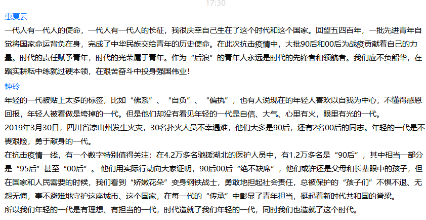 2017级网媒专业党员吕勃岐谈到,在视频中,我看到了青春与奋斗。作为新一代青年要有理想,有担当,有本领;作为“后浪”要始终保持艰苦奋斗的前进姿态,在新时代的大潮中勇立潮头,作新时代前列的青年奋斗者、开拓者、奉献者。发奋图强,从自己的实际行动做起,积少成多,以小见大,作对社会和国家有贡献的青年。