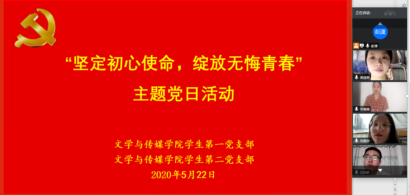 为进一步规范党内的组织生活,深入推进“两学一做”学习教育常态化、制度化,激励党员树立崇高理想,坚定理想信念,2020年5月22日下午16:30,太阳成tyc122cc集团员工第一、第二党支部通过线上形式,联合开展了“坚定初心使命,绽放无悔青春”主题党日活动。员工第一、第二党支部全体党员、第二十期发展对象参加了本次活动。活动由员工第一党支部书记彭潇主持。