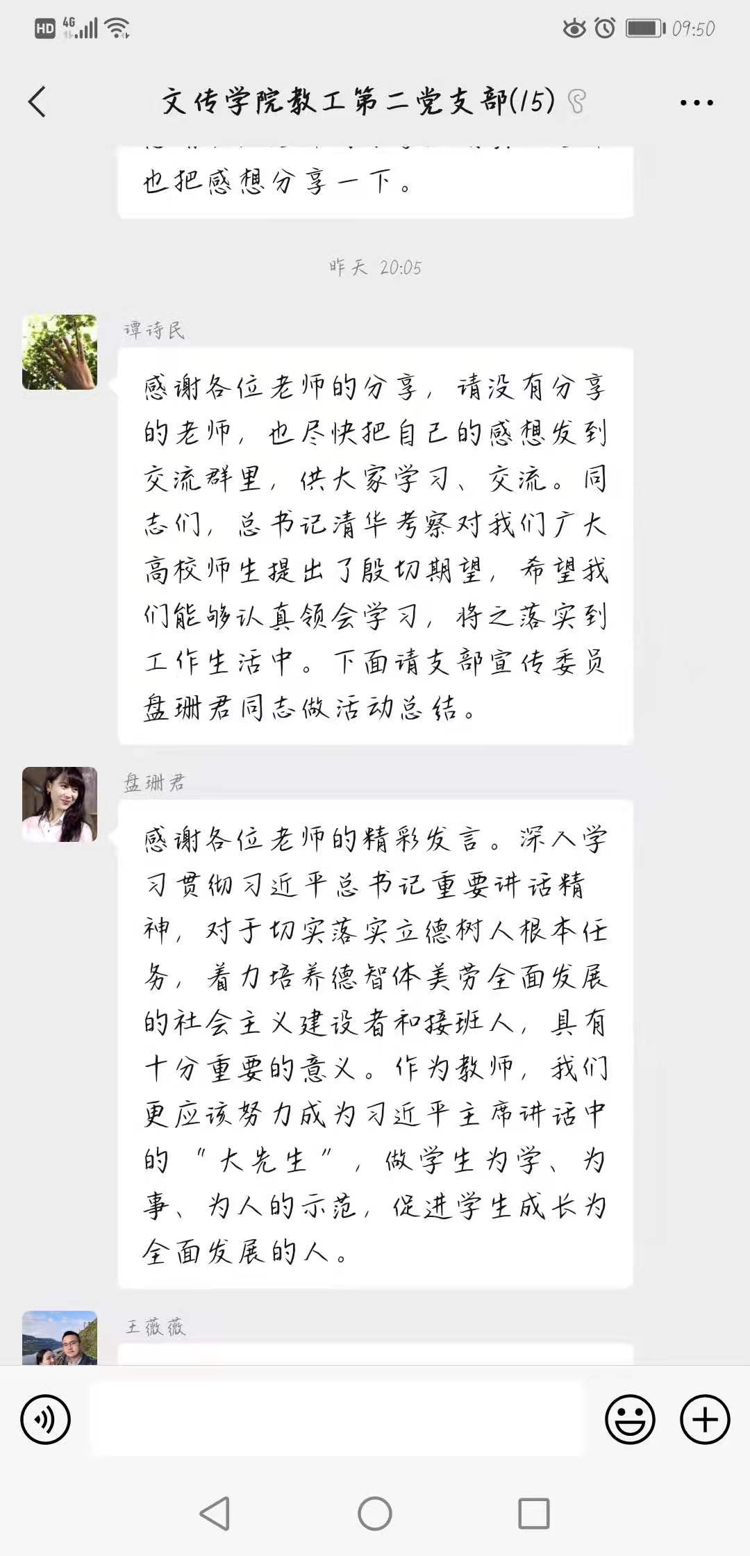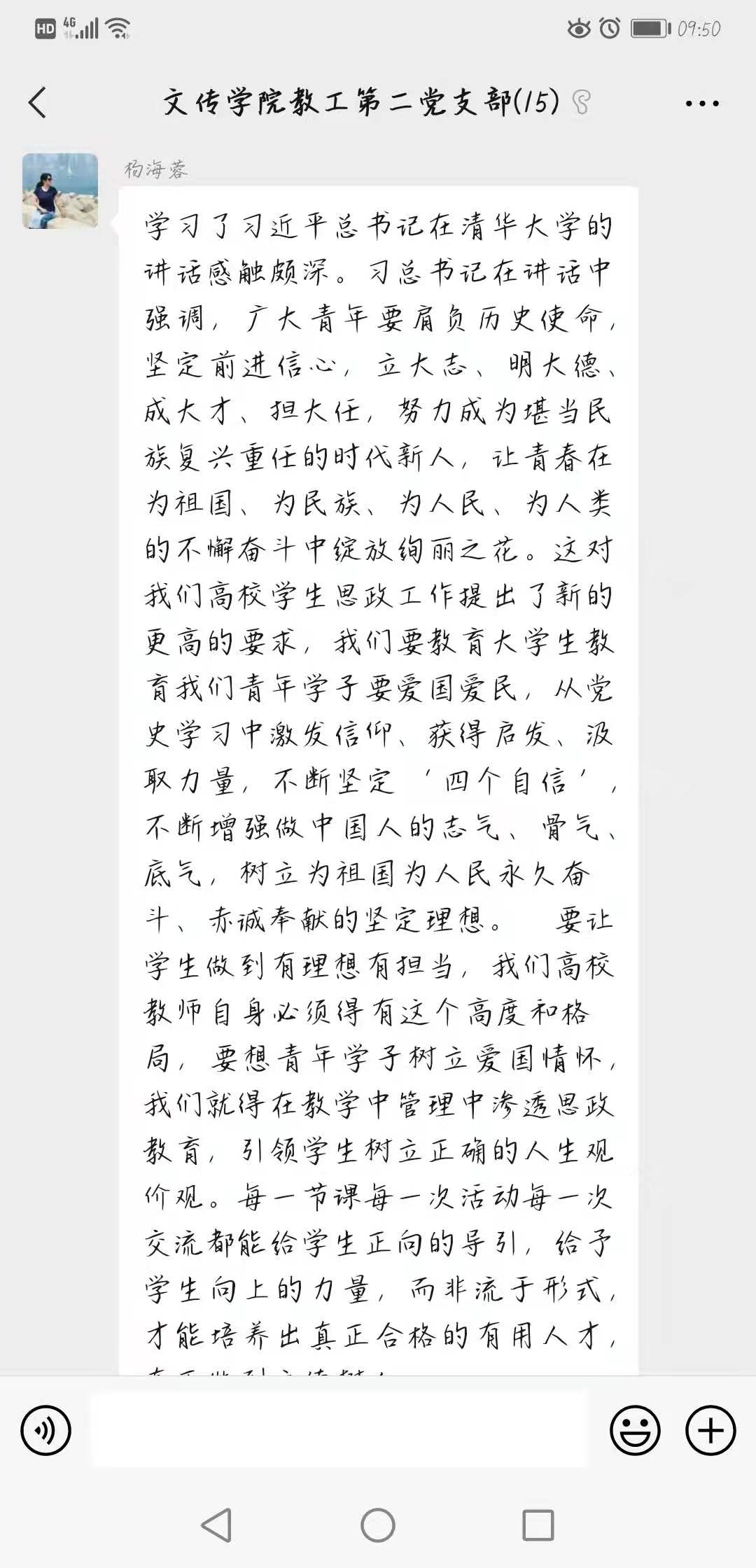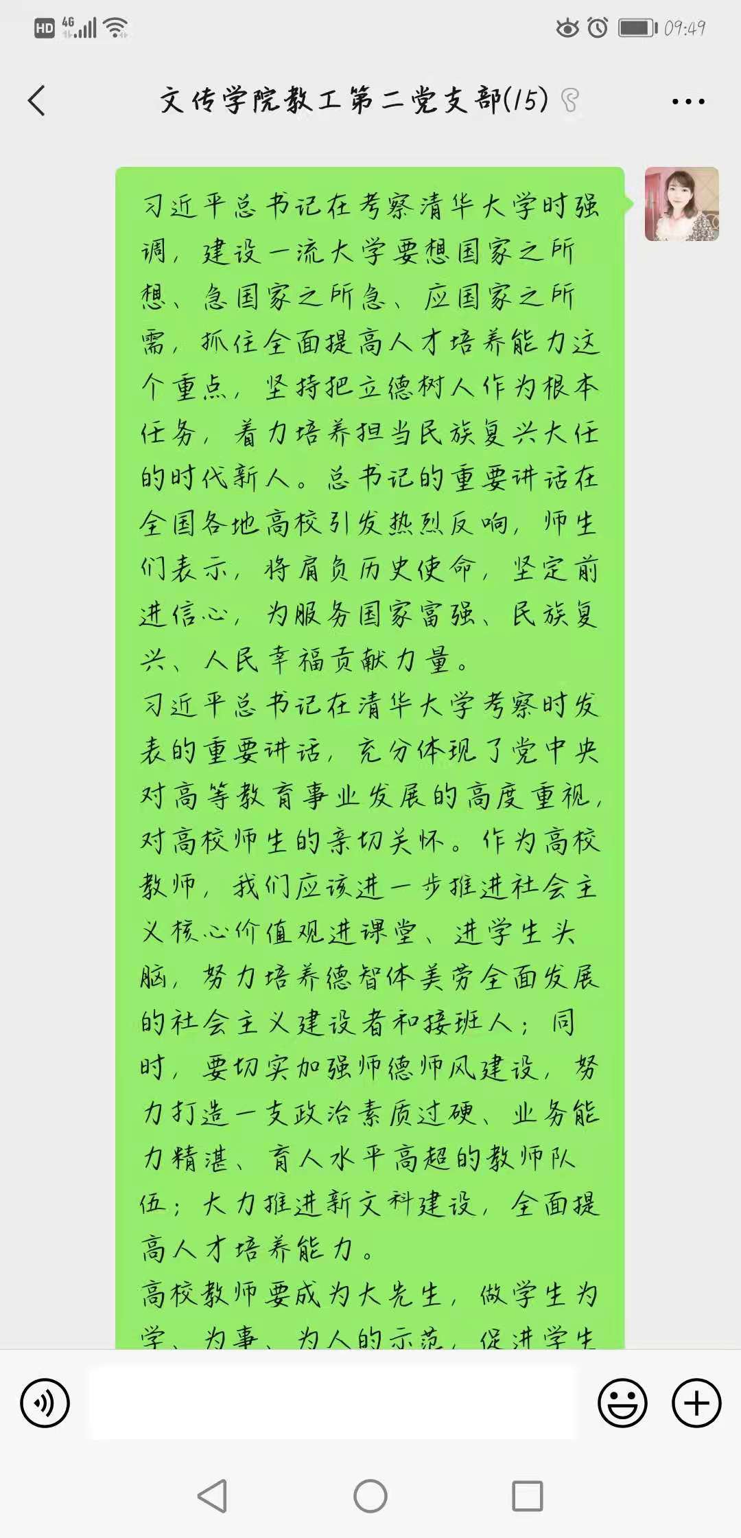支部同志一致认为,深入学习贯彻习近平总书记重要讲话精神,对于切实落实立德树人根本任务,着力培养德智体美劳全面发展的社会主义建设者和接班人,具有十分重要的意义。作为新时代的高校教师,应努力成为总书记讲话中的“大先生”,做员工为学、为事、为人的示范。