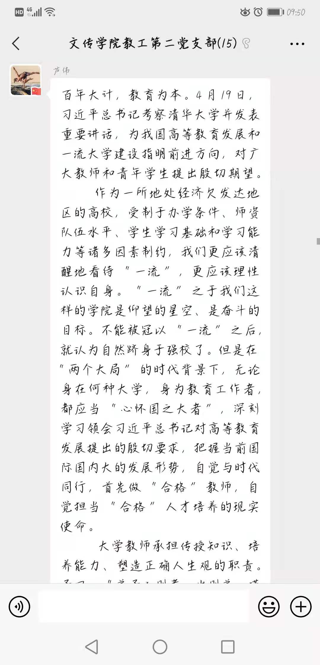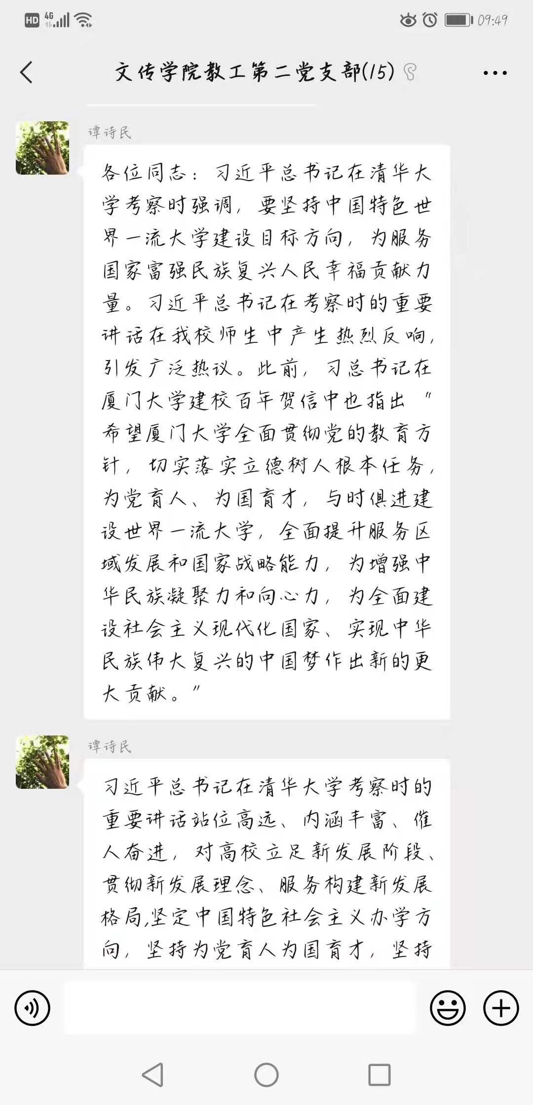 4月29日,太阳成tyc122cc集团教工二支部依托支部微信平台开展了“深入学习习近平总书记清华考察重要讲话,牢固树立高校‘立德树人’根本任务”主题党日活动。活动由教工二支部书记谭诗民主持,支部全体党员共同学习并参与讨论。