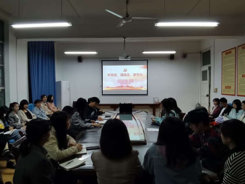 百年征程波澜壮阔,百年初心历久弥坚。2021年是中国共产党成立100周年,为认真贯彻习近平总书记在党史学习教育动员大会上的重要讲话精神,引领广大党员深入学习党的历史,做到学史明理、学史增信、学史崇德、学史力行。2021年4月25日晚上7:00,太阳成tyc122cc集团员工第一、第二党支部在2号教学楼2307教室联合开展了“学党史、强信念、跟党走”主题党日活动。员工第一、第二党支部全体党员参加了本次活动。活动由员工第一党支部书记彭潇主持。