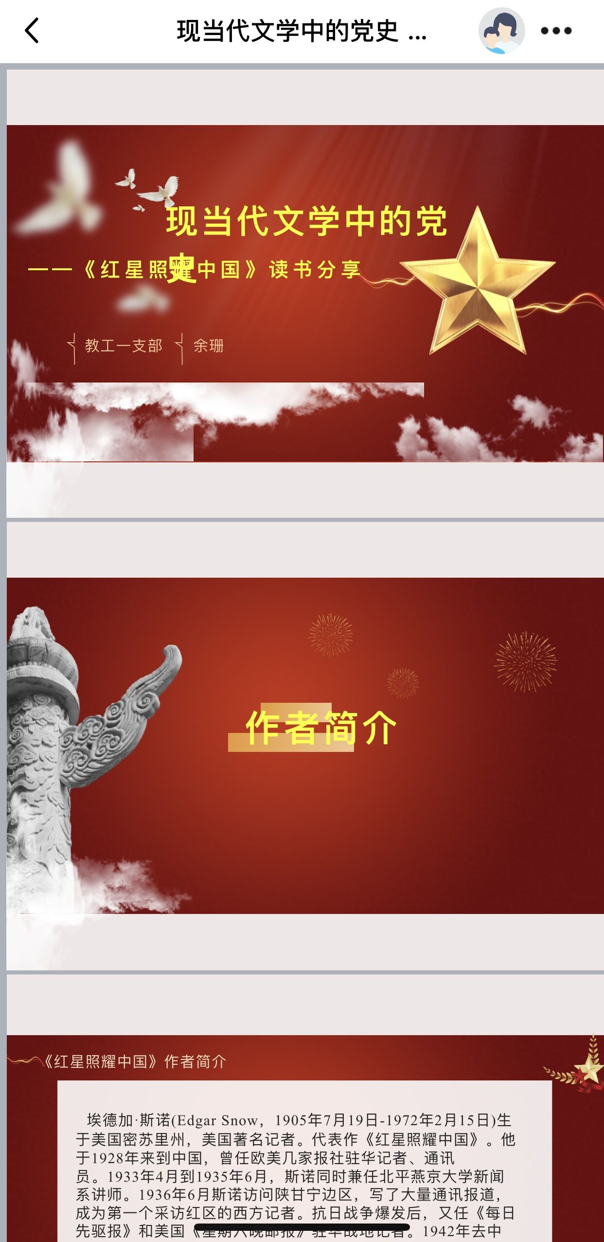 余珊同志从《红星照耀中国》一书的作者介绍到故事梗概的讲述,再到作品的赏析和现实意义四个角度向大家做了读书分享。《红星照耀中国》是一部文笔优美的纪实性很强的报道性作品。作者真实记录了自1936年6月至10月在我国西北革命根据地(以延安为中心的陕甘宁边区)进行实地采访的所见所闻,该书绝大部分素材来自作者采访的第一手资料,向全世界真实报道了中国和中国工农红军以及许多红军领袖、红军将领的情况。作者通过与中国共产党的领导人毛泽东、周恩来、朱德、刘志丹、贺龙、彭德怀等以及广大红军战士、农民、工人、知识分子的接触交往,了解了革命根据地政治、军事、经济、文化、生活各方面的真实情况,准确、鲜明、生动地反映了中国共产党和工农红军的斗争业绩。