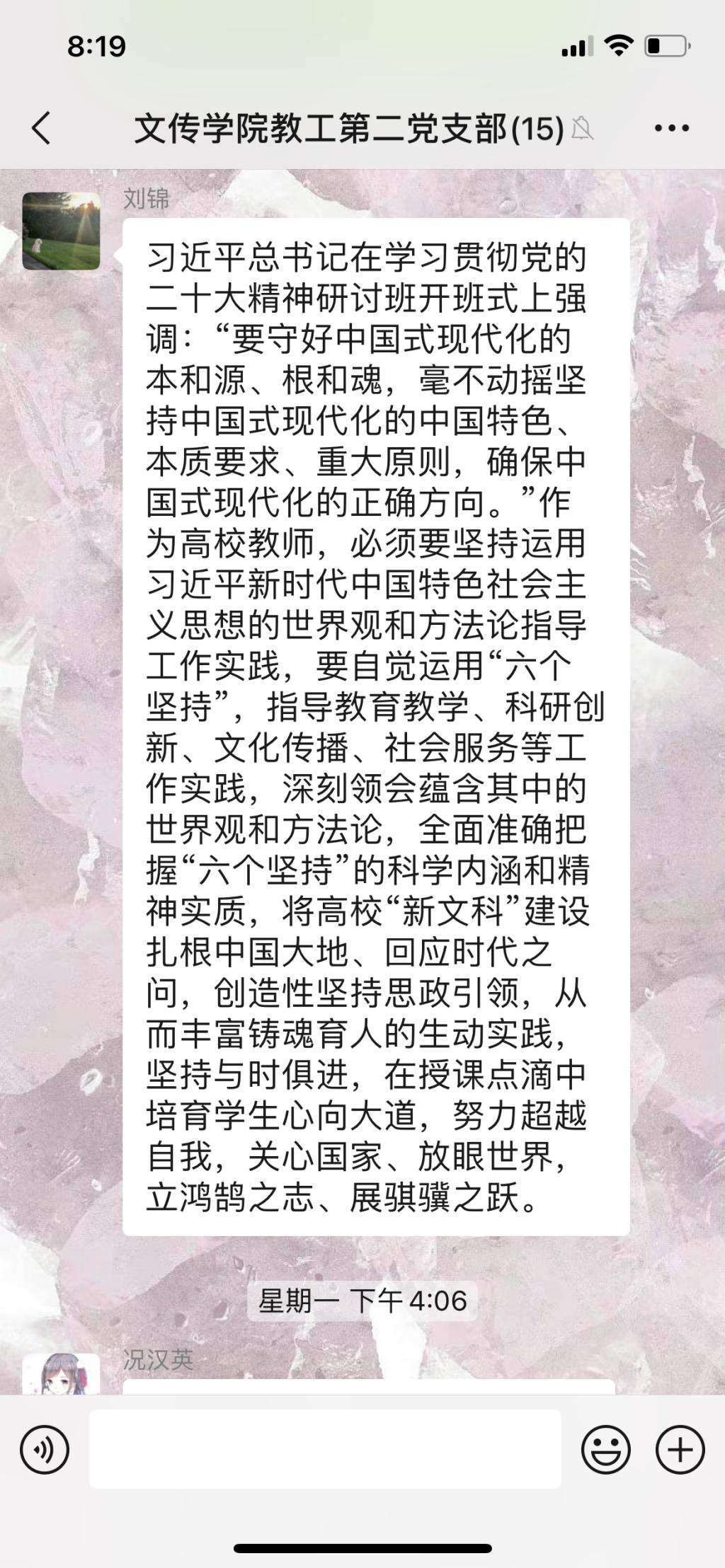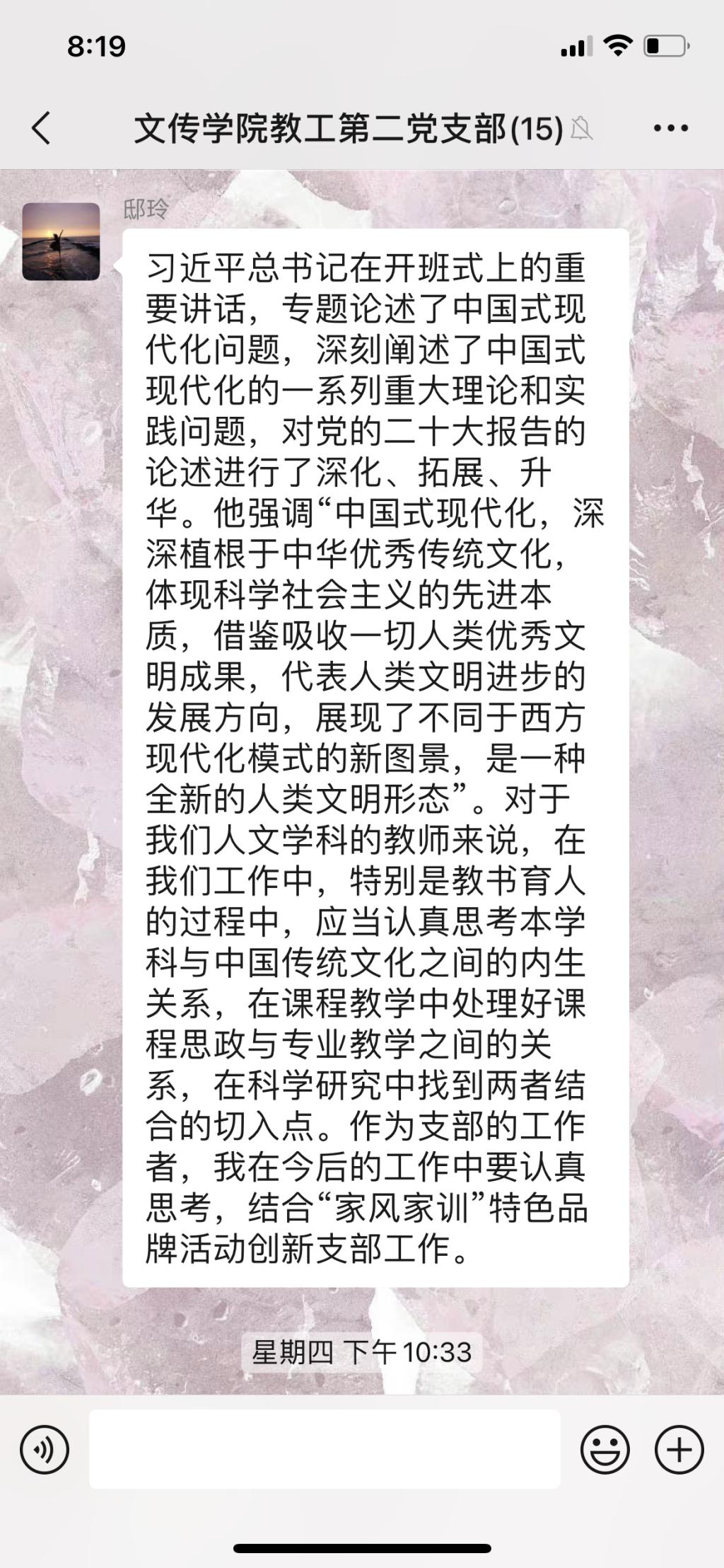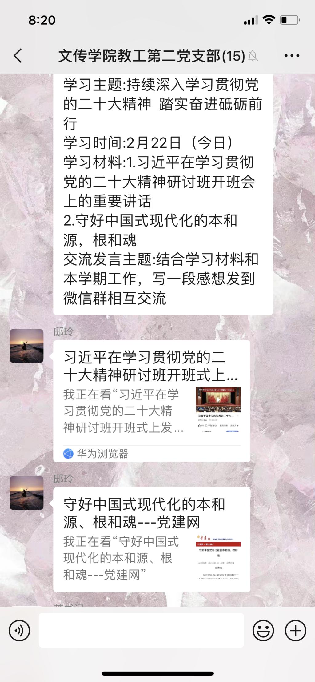 首先,支部书记邸玲领学了《习近平在学习贯彻党的二十大精神研讨班开班会上的重要讲话》和《守好中国式现代化的本和源,根和魂》。