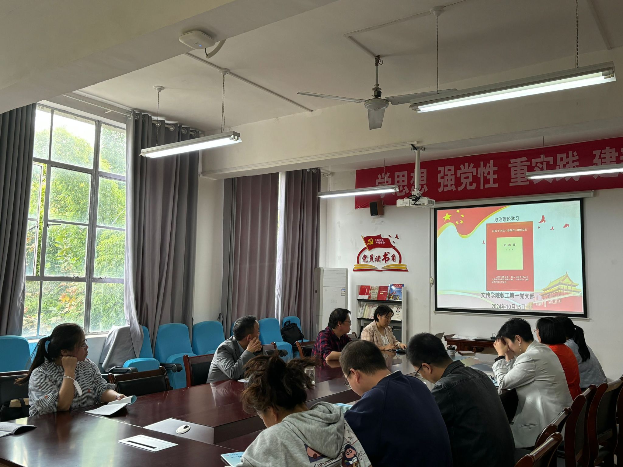 首先由支部书记韩文霞同志带领大家从内容简介、主要篇目、具体篇目学习三个维度对《论教育》进行了全面深入的研读。韩文霞同志指出,习近平总书记在书中多次强调教育是民族振兴、社会进步的重要基石,是功在当代、利在千秋的德政工程,是实现以中国式现代化全面推进强国建设、民族复兴伟业的先导任务、坚实基础、战略支撑。这一观点不仅深刻揭示了教育的战略地位,也为我们新时代教育事业的发展指明了方向。同时,韩书记也结合当前教育事业的实际情况,对文稿中的核心思想和重要论述进行了详细解读,引导大家展开了热烈的讨论和交流。