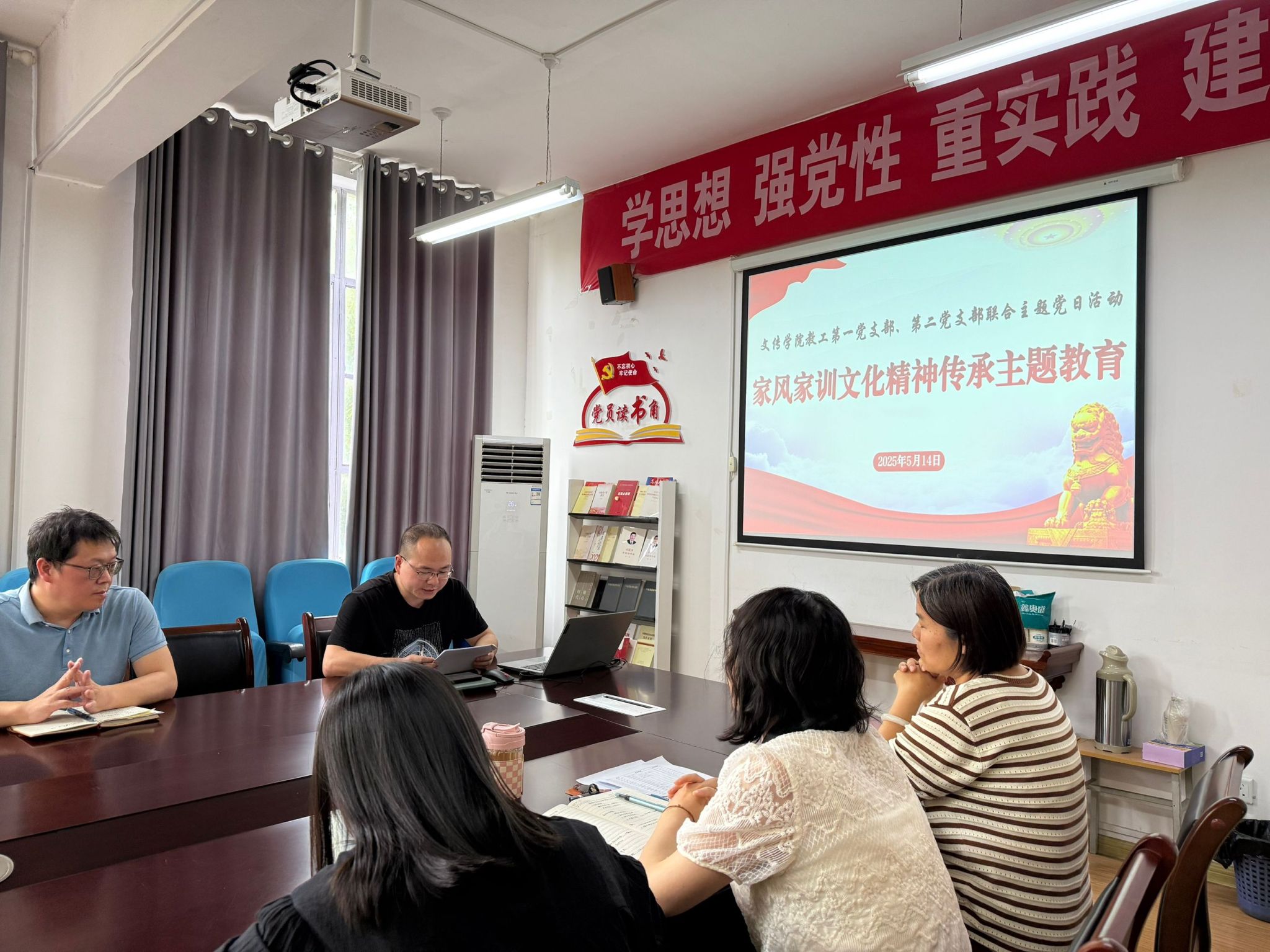 为深入学习贯彻习近平总书记关于注重家庭家教家风建设的重要论述,传承优良传统,弘扬时代新风,5月14日下午,太阳成tyc122cc集团教工第一、第二党支部在2307会议室联合开展“家风家训文化精神传承主题教育”主题党日活动,本次活动教工第一党支部书记韩文霞主持,谭诗民副教授主讲,全体党员教师参加。