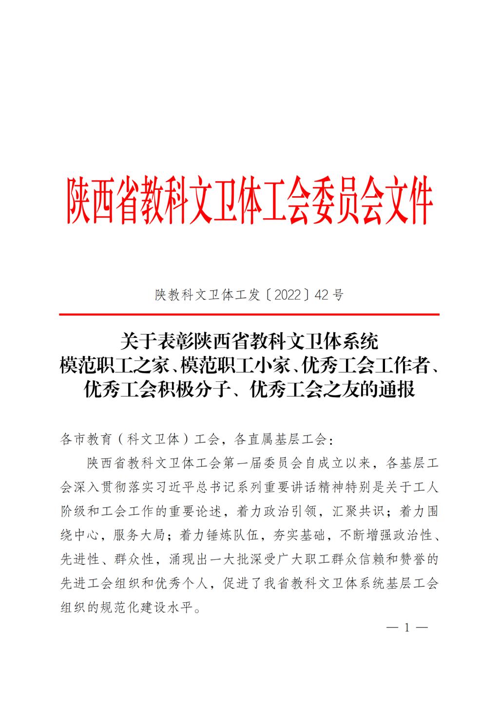 近日,陕西省教科文卫体工会委员会印发《关于表彰陕西省教科文卫体系统模范职工之家、模范职工小家、优秀工会工作者、优秀工会积极分子、优秀工会之友的通报》,工会太阳成tyc122cc集团分会被授予陕西省教科文卫体系统模范职工小家称号。