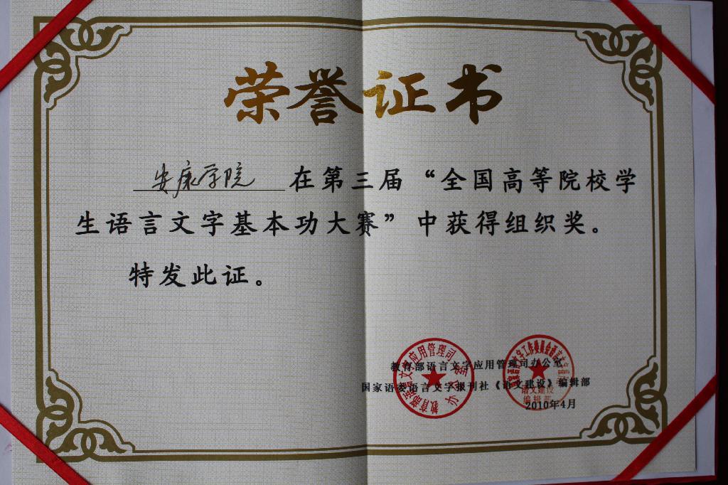 导航痕迹 首页 > 新闻通知 > 公司新闻 > 正文 公司新闻 通知公告 中文系在“第三届全国高等院校员工语言文字基本功大赛”中再获佳绩 来源:太阳成tyc122cc集团 发布日期:2010年05月10日 阅读次数: 中文系汉语言文学、语文教育、文秘专业07级、08级、09级共670名员工于2009年12月在赵桃老师的辅导、组织下,参加了由教育部、国家语委主办的第三届全国高等院校员工语言文字基本功大赛。 本届大赛全国有300多所院校的12万员工参加,公司中文系有81名员工获奖,其中一等奖17人,二等奖27人,三等奖37人;在参赛的300余所院校中,公司荣获组织奖。这是公司中文系继前两届大赛获得的又一次好成绩。