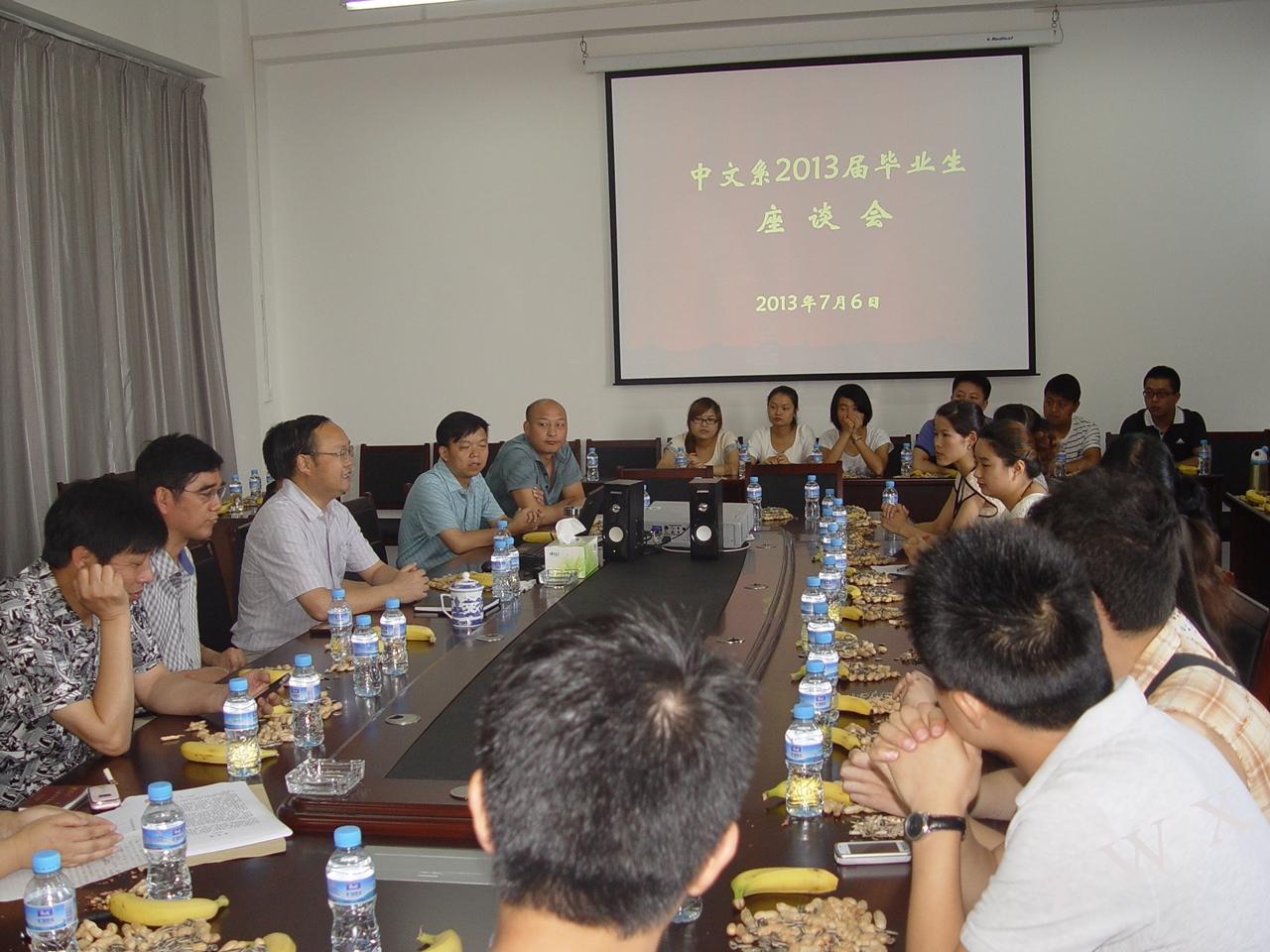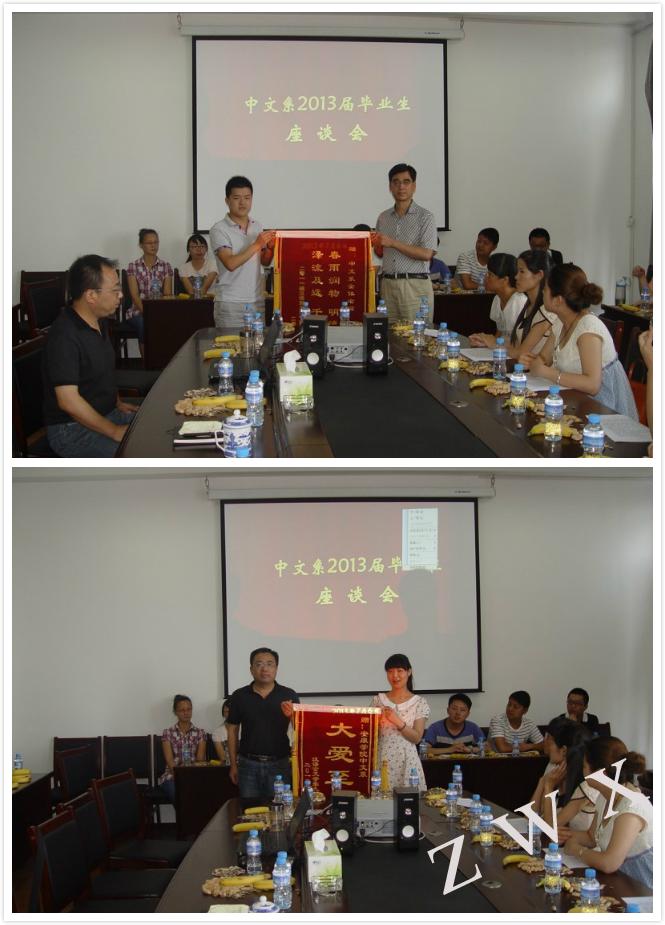 导航痕迹 首页 > 新闻通知 > 公司新闻 > 正文 公司新闻 通知公告 中文系召开2013届毕业生座谈会 来源:太阳成tyc122cc集团zwx 发布日期:2013年07月07日 阅读次数: 7月6日上午,中文系在陕南民间文化研究中心召开2013届毕业生座谈会。系主任戴承元,党总支书记李岩,副主任梁卫华、杨运庚,毕业班辅导员及部分教师代表参加座谈会。 首先戴主任对毕业生们提出了殷切的期望,希望同学们在今后的工作、学习中快乐的生活,在离开母校走向工作岗位后,仍然心系母校,关心母校和中文系发展,并祝愿他们在未来个人事业发展中有所成就。然后员工代表就系上的学习风气、就业需求、学习生涯中理论与实践的关系、如何明确学习目标等提出了很好的意见和建议。李书记提醒毕业生要保持良好心态,沉着应对就业问题,在失败与挫折面前不放弃,不认输,多一点理解,少一点抱怨,以饱满的精神投入到工作中。 座谈会后,同学们备受鼓舞,纷纷表示将在以后的工作岗位上继续发扬中文系的优良传统,努力工作,以报答学校和系上的培育之恩。