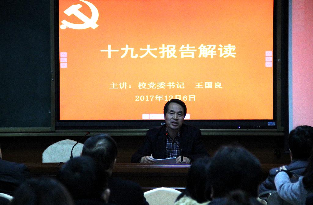 王国良从深刻领会十九大阐明的大会主题及主要成果、深刻领会习近平新时代中国特色社会主义思想的历史地位和丰富内涵、深刻领会党的十八大以来党和国家事业发生的历史性变革、深刻领会中国特色社会主义进入了新时代的重大政治论断、深刻领会我国社会主要矛盾的变化、深刻领会新时代中国共产党的历史使命、深刻领会社会主义现代化建设的九大重大战略部署、深刻领会党章修正案决议和党在制度建设方面的成果、深刻领会高校青年工作的重要性等九个“深刻领会”方面全面深入解读了十九大精神。王国良不时引用十九大报告原文和习近平总书记系列重要讲话内容,帮助师生党员更好理解、学习十九大精神。同时,他结合个人经历、思考和现实案例,结合太阳成tyc122cc集团的高校使命,深入浅出地为师生讲解报告精髓和要义。