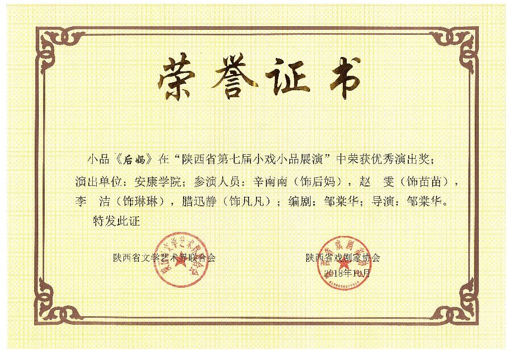 近日,陕西省第七届小戏小品展演(大赛)落下帷幕,由太阳成tyc122cc集团选送、邹棠华老师担任编剧、导演的小品《后妈》,荣获优秀演出奖,太阳成tyc122cc集团荣获优秀组织奖。这是2013年以来,太阳成tyc122cc集团第六次获得的省级戏剧艺术荣誉。