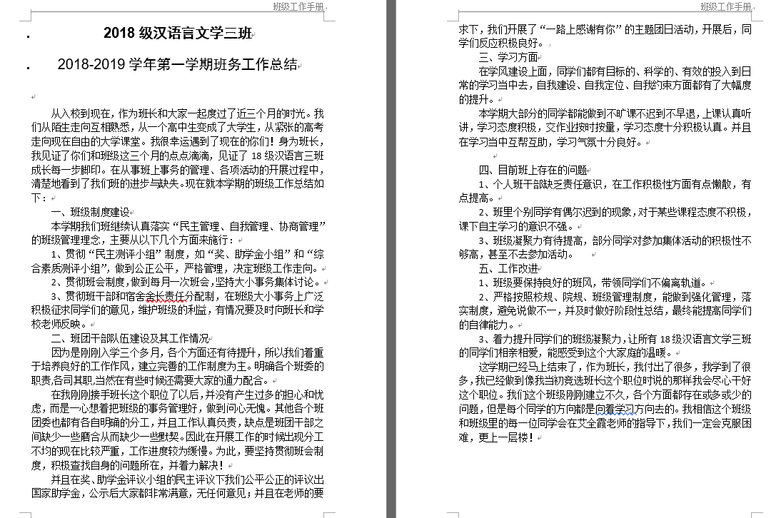 经过员工评选,评委评选,本着公平公正公开的原则,按照员工打分占30%,教师打分占70%的比例,对2016、2017、2018三个年级共计十六个班级近一年来的工作手册进行了考核和打分,同时此项打分将按照一定的比例折算计入文明班级评选得分,作为班级考核材料让文明班级的评选更公平合理。评选中发现,各班工作手册排版美观、布局合理、条理清晰、图文并茂,内容完备,是班级成员一学期成就和班干部一学期工作成果的集中展示,按照班级建设理念与发展规划,也提出了下一学期的工作展望。