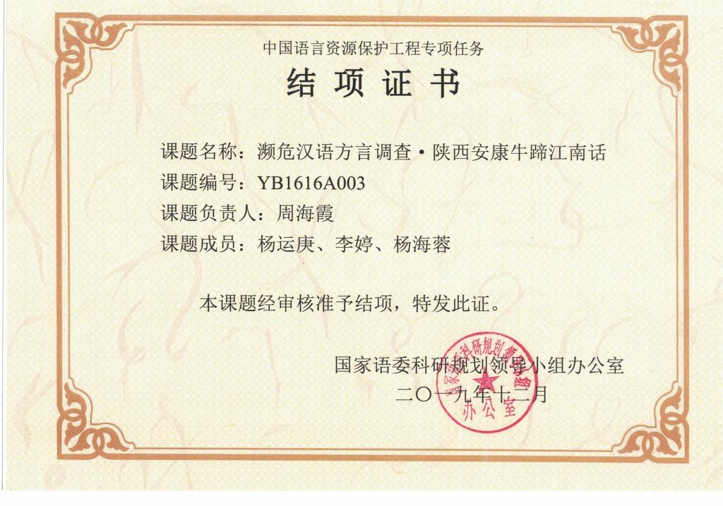 导航痕迹 首页 > 新闻通知 > 公司新闻 > 正文 公司新闻 通知公告 太阳成tyc122cc集团教师周海霞主持的中国语言资源保护工程重点专项项目顺利结题 来源:太阳成tyc122cc集团 发布日期:2020年10月28日 阅读次数: 公司教师周海霞主持的中国语言资源保护工程重点专项项目“濒危汉语方言调查·陕西安康牛蹄江南话”顺利通过结题验收,音频、视频、文字资料全部合格并收入中国语言资源库。 “濒危汉语方言调查·陕西安康牛蹄江南话”项目2016年4月正式被国家语委科研规划领导小组办公室立项,到账经费18万元,牛蹄江南话也是本批中国语言资源保护工程项目确定列入的陕南范围内的唯一一个濒危汉语方言保护调查点。本项目研究历时三年六个月,项目成果录制音频、视频资料各3828条,收集方言民俗照片100余幅,形成方言志书文字材料30余万字。 撰稿/周海霞 审核/杨运庚 发布/崔瑜