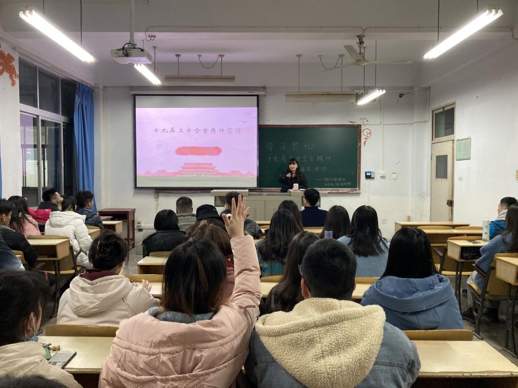 杜佳睿围绕“充分认识党的十九届五中全会的重大意义”“深刻认识‘十四五’规划建议的起草过程、主要内容及亮点特色”“准确把握2035年远景目标和‘十四五’时期我国发展的指导方针、主要目标、重点任务”等内容进行了领学,带领大家一起明晰了全会的重要意义和精神内涵,要号召同学们认真学习贯彻十九届五中全会精神,学好新思想,争做新青年。