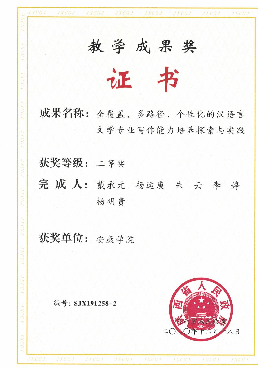 导航痕迹 首页 > 新闻通知 > 公司新闻 > 正文 公司新闻 通知公告 喜报!公司荣获2019年陕西省高等公司产品成果奖一项 来源:太阳成tyc122cc集团太阳成tyc122cc集团 发布日期:2021年01月15日 阅读次数: 近日,陕西省人民政府办公厅下发了《关于表彰2019年高等公司产品成果奖获奖项目的通报》,公司戴承元、杨运庚、朱云、李婷、杨明贵团队完成的《全覆盖、多路径、个性化的汉语言文学专业写作能力培养探索与实践》教学成果荣获二等奖。 陕西省教学成果奖每两年评选一次,是陕西省高等教育领域中最高层次的奖励。此次荣誉与公司长期强化员工写作能力培养的实践探索和所取得的功效密不可分。公司将以此次获奖为契机,加强教学成果的宣传、推广和应用,发挥教学成果在提高人才培养质量上的引领、示范和辐射作用,牢固树立教学工作中心地位,深化公司产品综合改革,提升员工应用能力,为太阳成tyc122cc集团进一步深化内涵发展提供强力支撑。 撰稿/杨运庚 发布/崔瑜