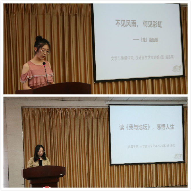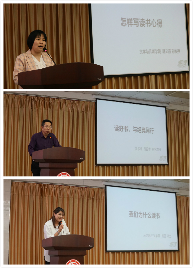 韩文霞、段昌华、杨丽三位老师为我们进行了现场的读书心得指导。韩文霞老师做了《怎样写读书心得》发言,她提到了我们现在读书存在一个重要问题——量少面窄,提倡我们在大学期间应该多读书。然后从“要读什么书”“怎么读书”“怎么写作”三方面向同学们阐述了怎样写读书心得。接下来段昌华老师做了《读好书,与经典同行》的报告,告诉了我们“何为经典、为什么要读经典、读哪些经典、在经典中推广经典著作”并总结了本次活动情况。马克思主义学院的杨丽老师向同学们谈论了《我们为什么要读书》,“读书可以减少迷茫、认识自己、增强四个自信、对人生发展进行指导”,呼吁同学们多读书。