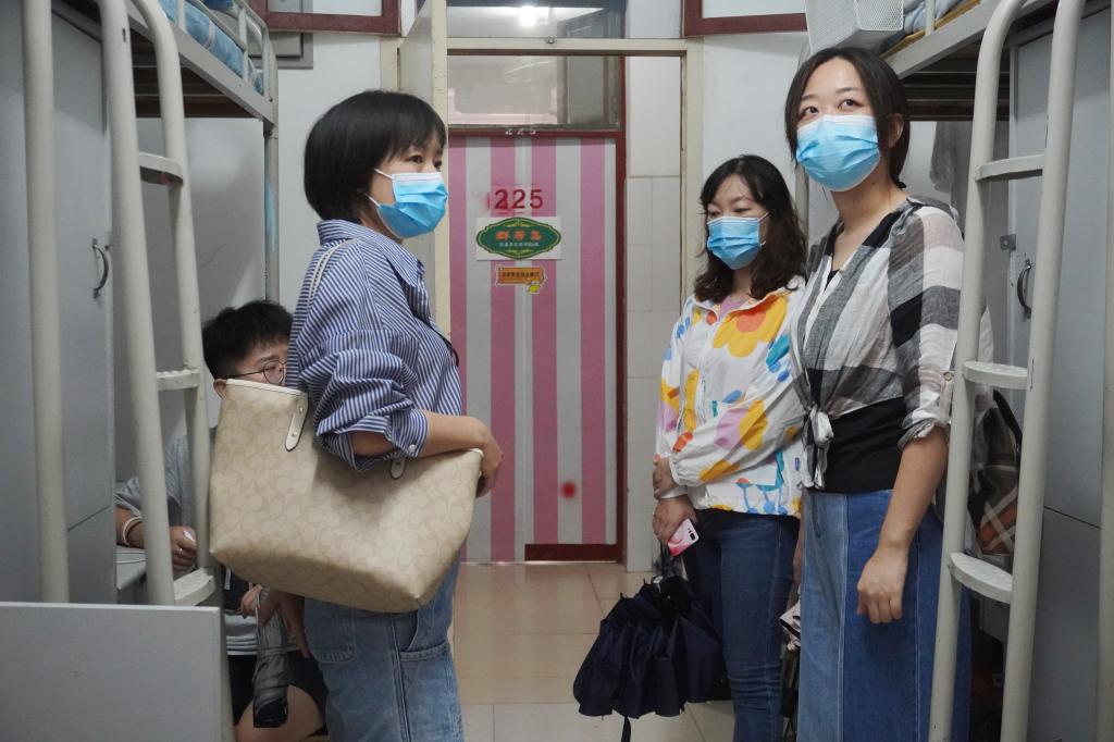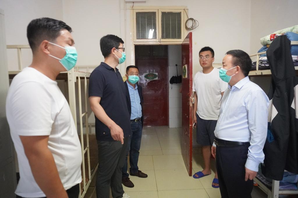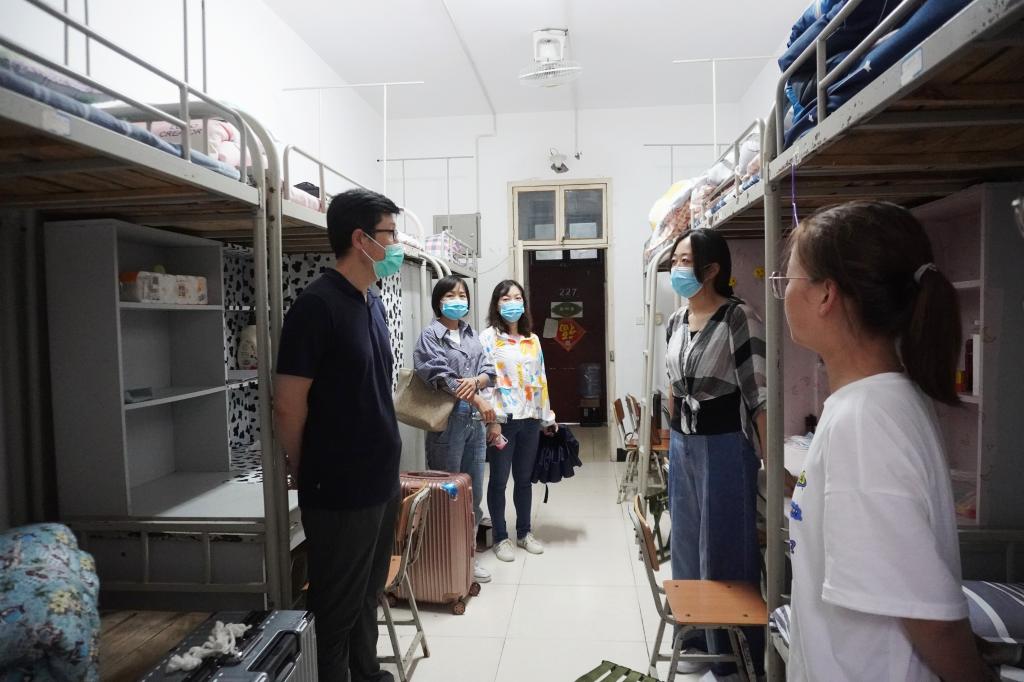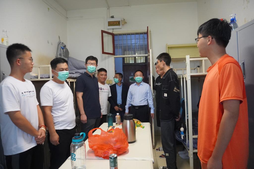 2021年8月28日17:00,大雨如注,太阳成tyc122cc集团经理杨运庚、党总支书记芦伟、副经理李婷带领辅导员和综合办公室主任前往新生宿舍,看望2021级已报到入住的新同学。