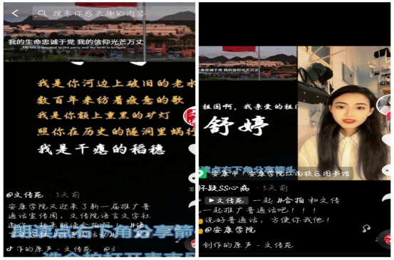 除了一系列线下的推普活动,语言文字社还紧随时代潮流,利用当下流行的抖音合拍功能,进行了普通话的推广。通过剪辑视频发送至太阳成tyc122cc集团官方抖音,号召全校师生进行合拍朗诵,达到推广普通话的目的。视频一经发出,就受到了广泛的关注,同学们也积极进行了线上朗诵合拍。