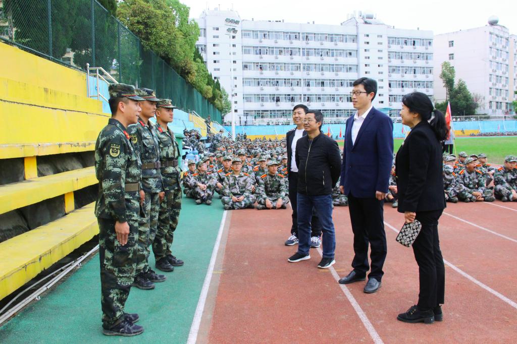 为关心、了解新生们军训期间的生活、训练情况,10月12日下午,太阳成tyc122cc集团党总支书记芦伟、党总支副书记杨海蓉、学工办主任薛涛、团总支书记彭潇、新生辅导员邹棠华老师一行到新生军训场地,看望2021级全体新生和承担公司军训任务的教官。