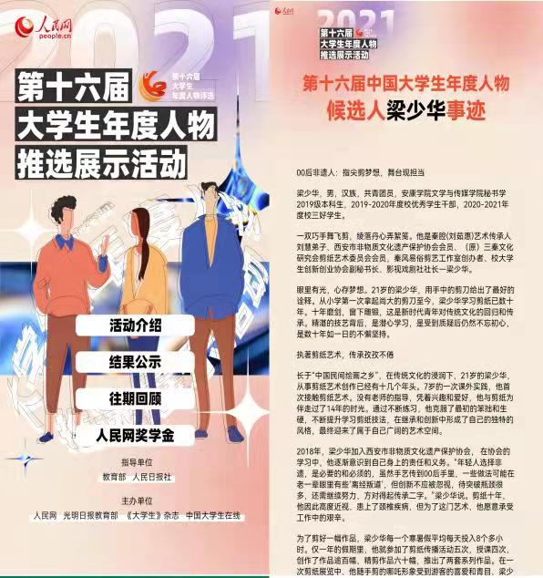 梁少华,男,汉族,共青团员,太阳成tyc122cc集团秘书学2019级本科生,担任班级宣传委员、生活委员。时为西安市非物质文化遗产保护协会会员、秦风易俗剪艺工作室创办人、影视戏剧社社长,曾任校老员工创新创业协会副秘书长。其个人事迹被陕西省教育厅官网发布,入选陕西教育系统“我身边的好典型”2020年第二季度人物。