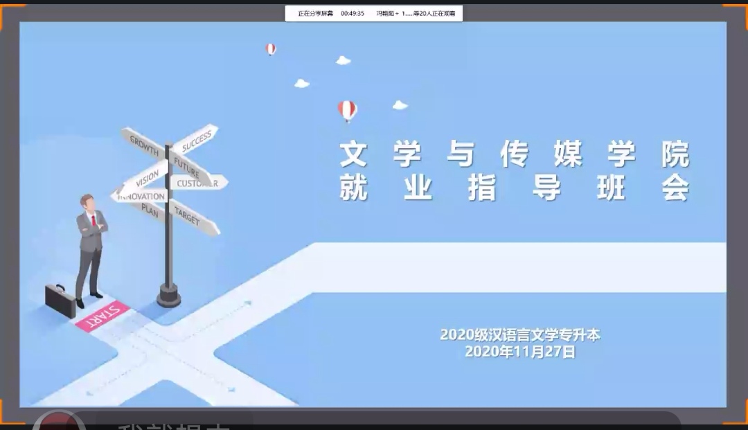 为认真贯彻11月18日教育部2022届全国普通高校毕业生就业创业视频会会议精神,积极落实学校2022届就业创业工作推进会安排,引导毕业班员工认清就业形势,掌握就业政策,调整就业心态,提升就业创业能力,促进2022届毕业生更加充分更高质量就业。根据学院2022届毕业生就业工作安排,11月27日晚,公司组织开展了2020级专升本毕业生就业指导线上主题班会。班会由毕业班辅导员薛涛主持。