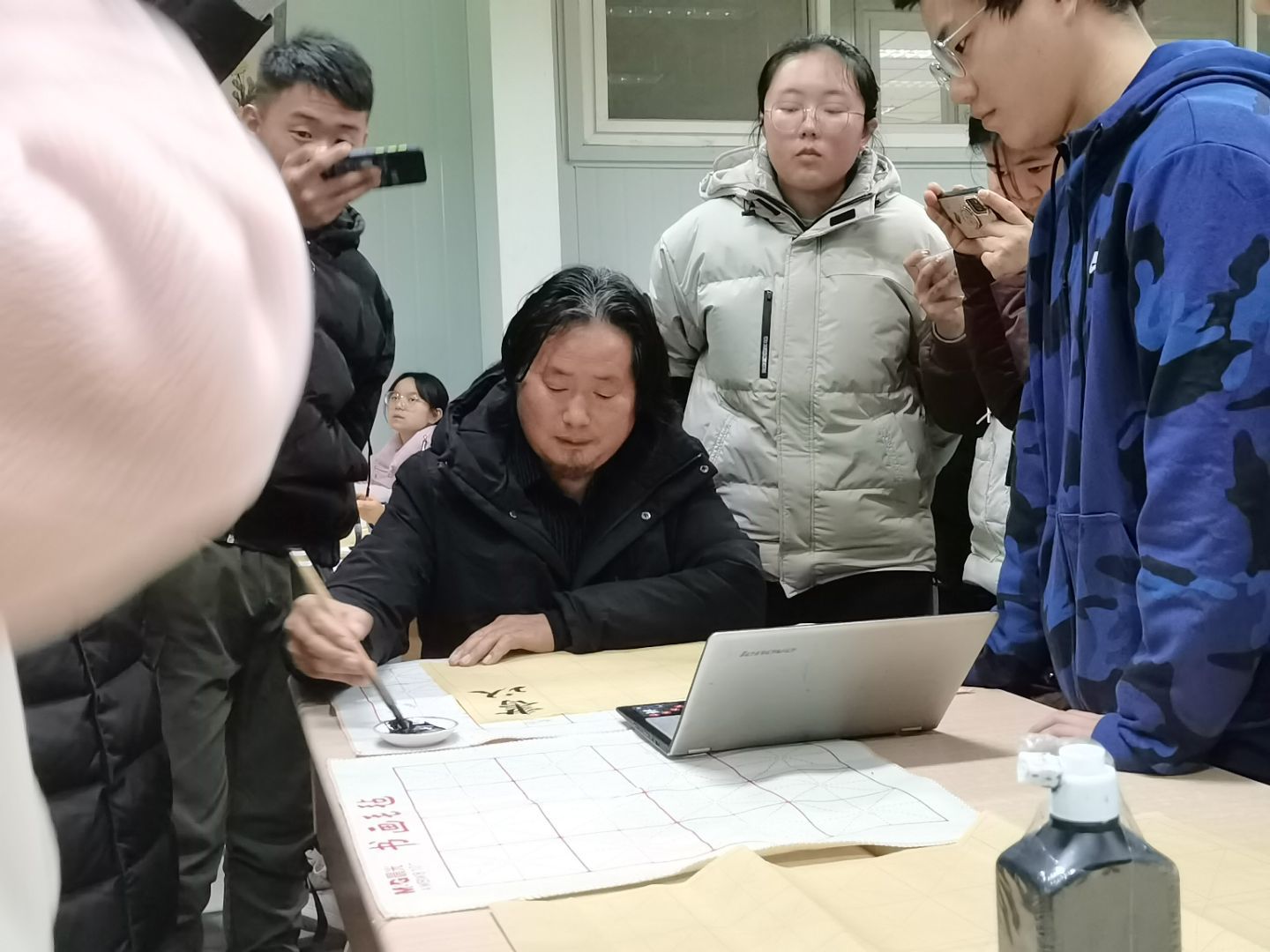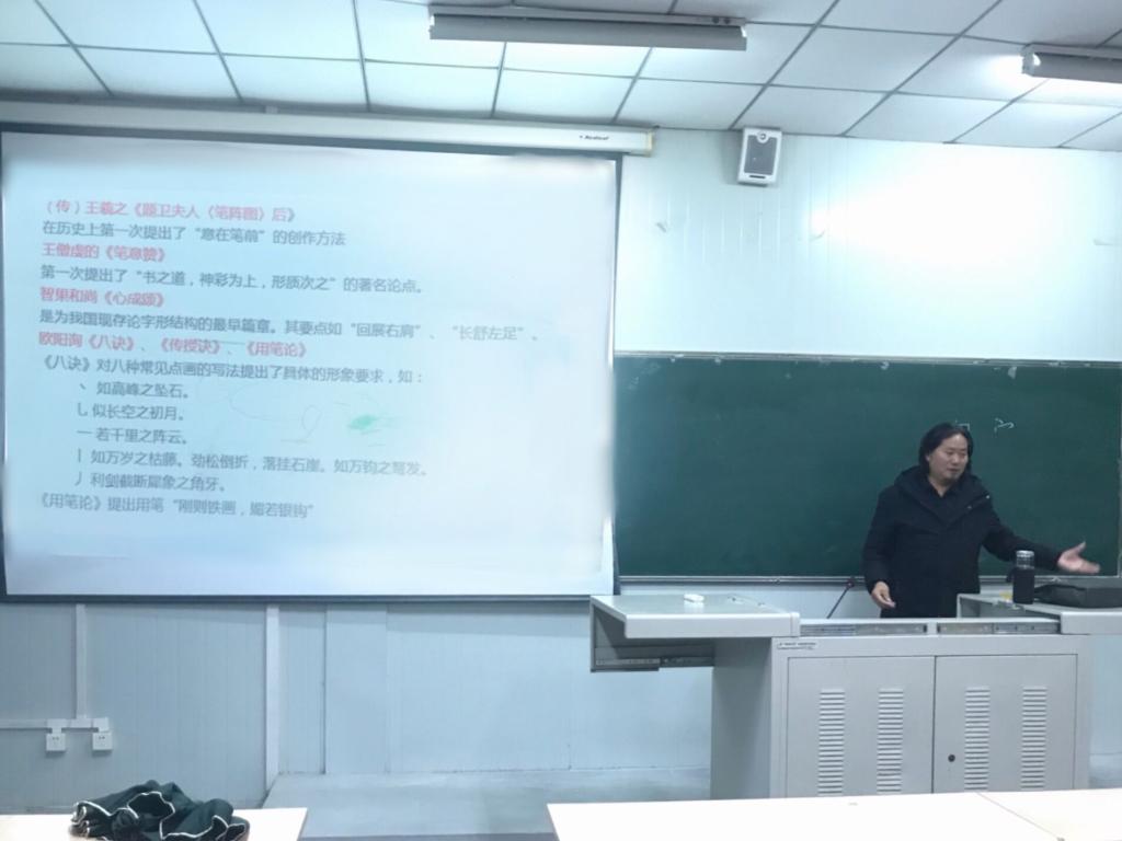 王关棣先生分析了中国书法艺术的唯一性、抽象性、艺术性,介绍了《笔论》《九势》《书谱》等历代经典书法理论著作,总结了中国古代书法理论发展的突出特点,以《书谱》为例分析如何品评书法作品,指导临摹颜体、欧体等经典书体的入门技巧。在书法理论、书法品评讲解的基础上,还对同学们的书法临帖进行了现场指导和示范。