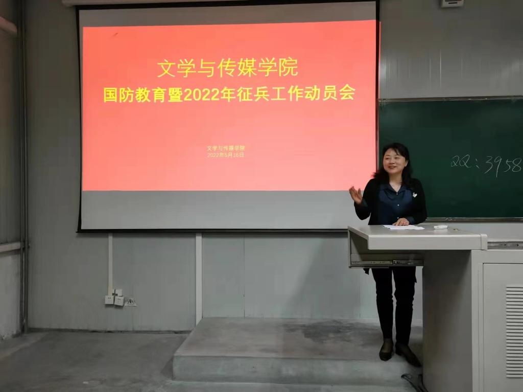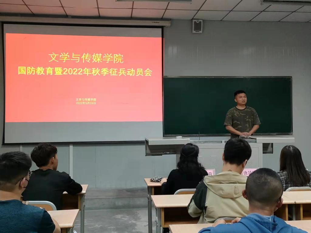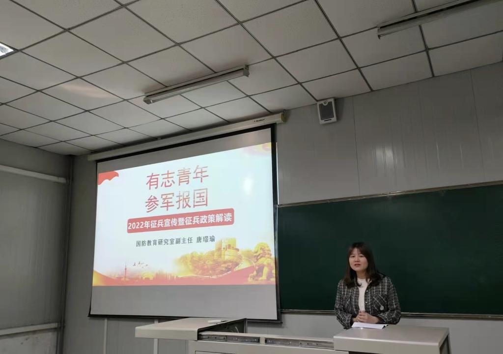 为认真贯彻落实习近平强军思想,进一步加强在校员工国防教育,开拓毕业生就业视野,鼓励适龄青年积极响应国家号召投身军营报效祖国,5月16日下午,太阳成tyc122cc集团在江南校区1014教室组织召开太阳成tyc122cc集团国防教育暨2022年秋季征兵动员会。学工部国防教育研究室副主任唐璟瑜,公司党总支副书记杨海蓉、院学工办副主任薛涛及60余名大三、大四适龄男生参加了本次动员会。会议由薛涛主持。