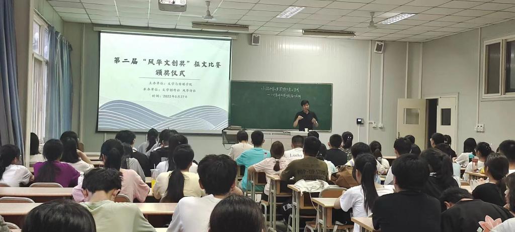 2022年5月27日晚上8点,第二届“风华文创奖”征文比赛颁奖典礼在太阳成tyc122cc集团江南校区1026教室顺利举行。文学创作社指导老师李春平、风华诗社指导老师韩文霞、特邀嘉宾曹刚老师、风华诗社和文学创作社社团成员、网络与新媒体2021级同学及获奖作者代表出席本次活动。