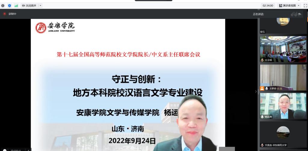 9月24-25日,由教育部中国语言文学类专业教学指导委员会指导,由高等师范院校中文专业联盟理事会、高等教育出版社、山东师范大学联合主办的第十七届全国高等师范院校文学院经理/中文系主任联席会议在山东师范大学召开,会议通过线上线下结合的方式举行,全国80余所师范院校的150余名文学院经理、中文系主任参加了会议。公司经理杨运庚教授以线上的方式参加了会议并做了大会报告。