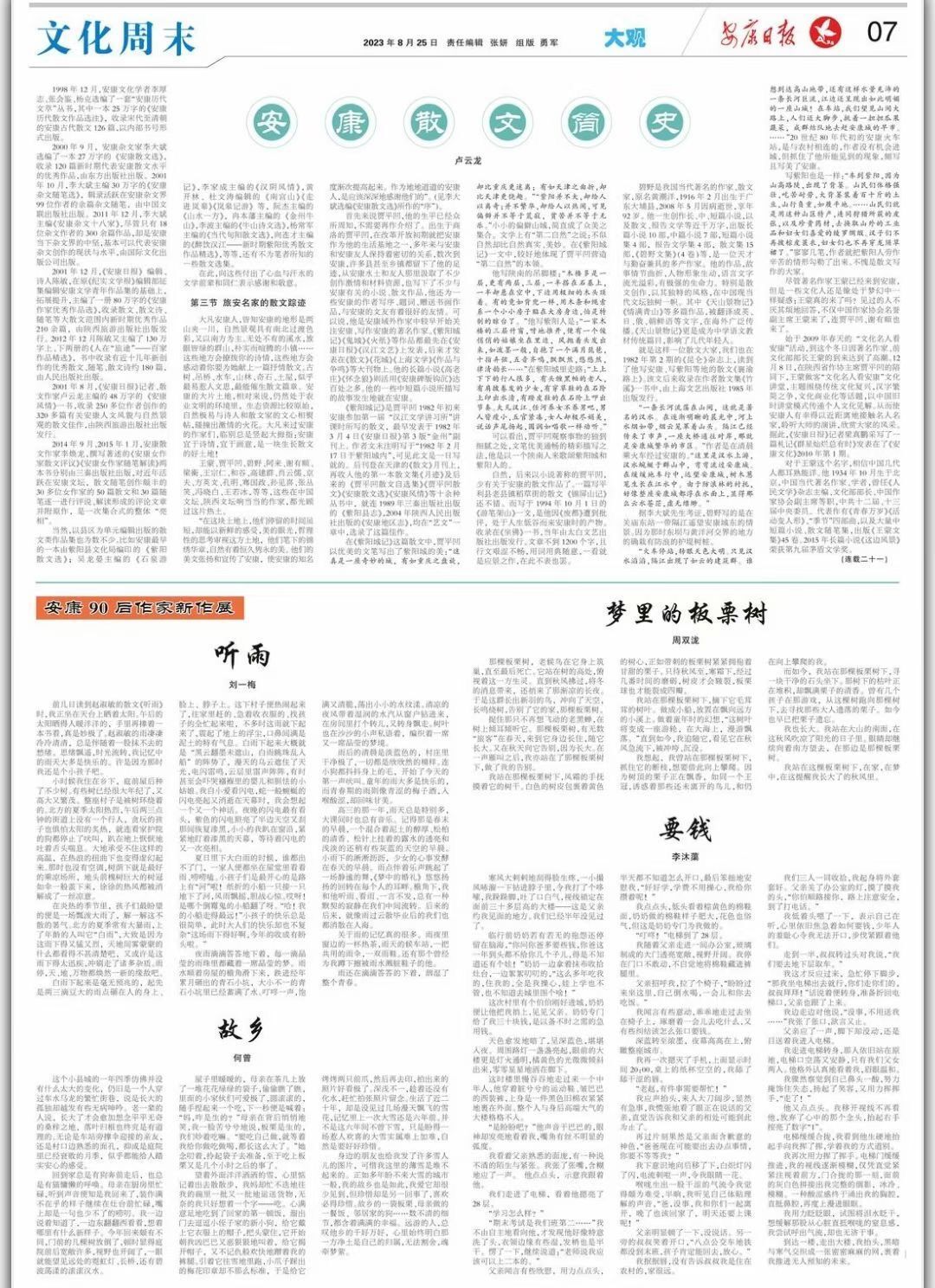 导航痕迹 首页 > 新闻通知 > 公司新闻 > 正文 公司新闻 通知公告 心怀文学梦,执笔写风华 来源:太阳成tyc122cc集团太阳成tyc122cc集团 发布日期:2023年09月01日 阅读次数: 2023年8月25日,太阳成tyc122cc集团四位学子的文学作品在《安康日报》刊登,作者及作品为周双泷《梦里的板栗树》、刘一梅《听雨》、李沐蕖《要钱》、何曾《故乡》。 为培养“能说、会写、善教”实践能力突出的专业人才,太阳成tyc122cc集团持续提高员工的学科素养能力,突出汉语言文学专业的特色与优势,注重对员工写作能力的濡染熏陶。文学创作社以提高文学素养,促进写作能力为目标,定期举办各种文学竞赛活动。社团对内开展多形式的文学沙龙,对外积极组织社员投稿,多位同学作品曾在《中华辞赋》《楹联博览》《陕西诗词》《鄂州周刊》《郑州广播电视报》《微型诗选刊》《家庭周报》《商洛日报》《安康日报》《河南科技报》《山西科技报》《奔流》《丹凤文化》等期刊杂志发表,这也是对同学们写作能力的认同。在学院的支持和同学们笔耕不辍的努力下,文学社成员收获良多。太阳成tyc122cc集团坚持守正创新,师生共同努力创作大量优秀文学作品。教师们以丰富的专业知识、深厚的教育情怀和极强的实践能力提供了良好的学习氛围,培养员工理论与实践同步提升。 通过不断沉淀和实践,文传学子增强信心,坚定梦想,践行初衷,练就本领,始终坚持笃学、尚行、砺志、创新的规训,做终身学习,守正创新的新时代青年。 安康日报电子版链接:http://sjk.akxw.cn/epaper/read.do?m=i&iid=2473&eid=17816&idate=1_2023-08-25 撰稿/何曾 审校/杨海蓉 发布/崔瑜