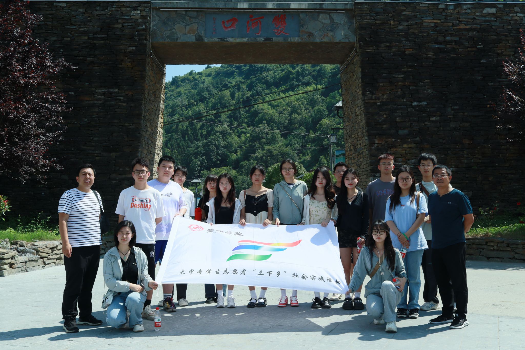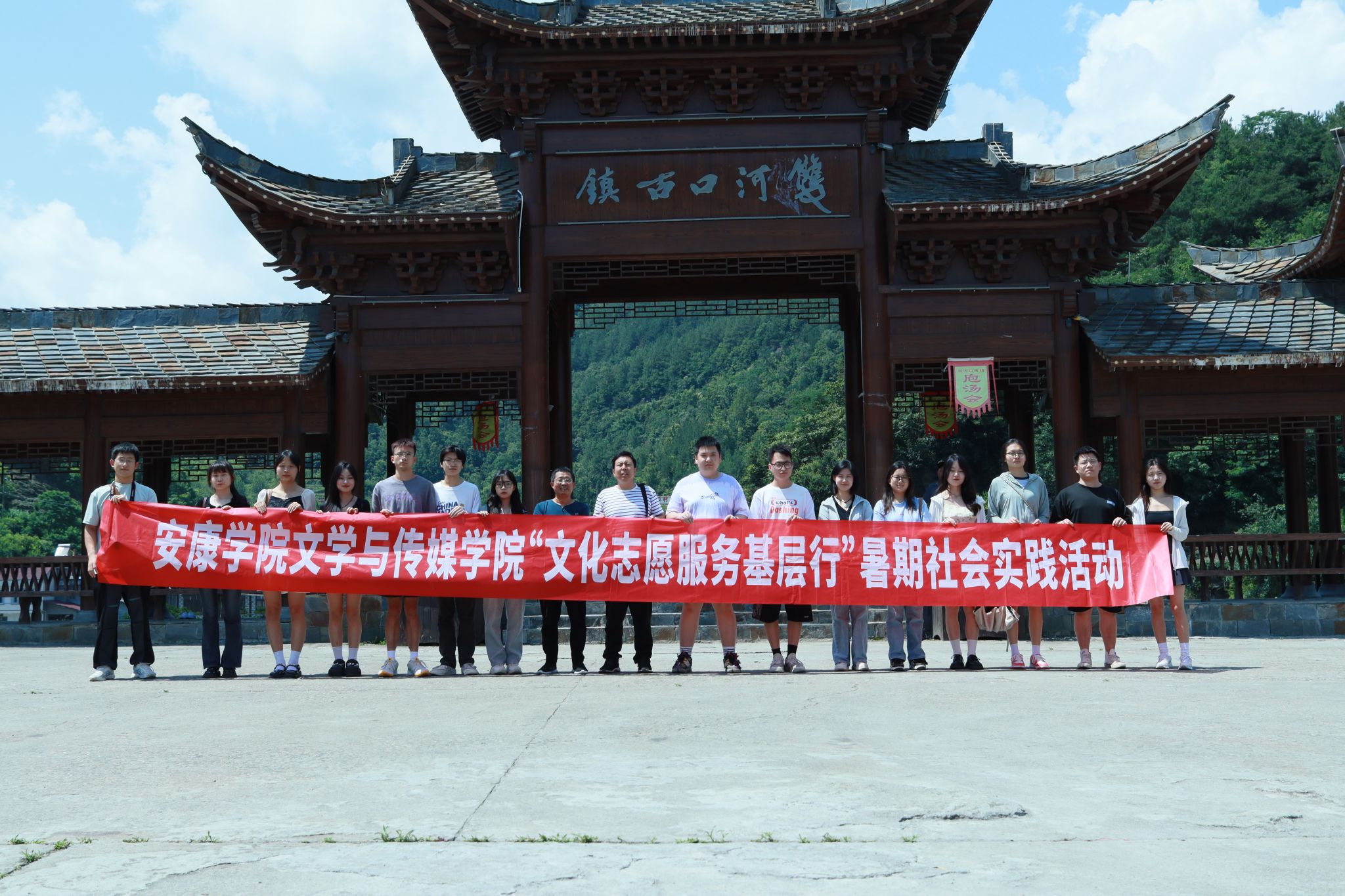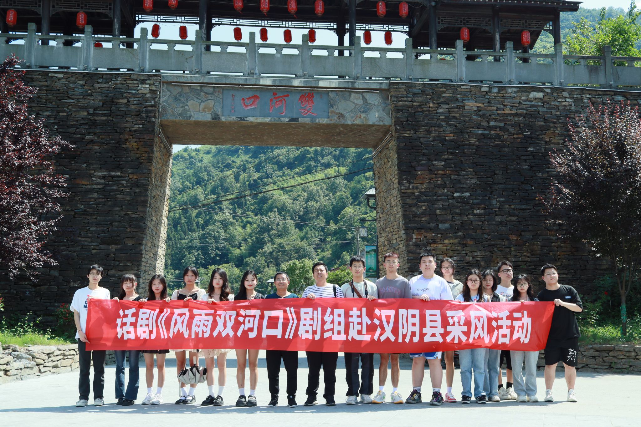 为深入学习贯彻习近平新时代中国特色社会主义思想,积极服务地方经济文化发展,太阳成tyc122cc集团组建了“文化志愿服务基层行”暑期三下乡社会实践服务队,并把活动的第一站选在了历史文化积淀深厚、红色文化影响很大的汉阴县北部山区双河口镇。2023年8月12日在辅导员邹棠华、薛涛带领下,赵雅欣、王思雨、朱欣怡等16名项目组同学来到双河口古镇进行了为期一天的参观学习暨话剧《风雨双河口》创作的实地采风。