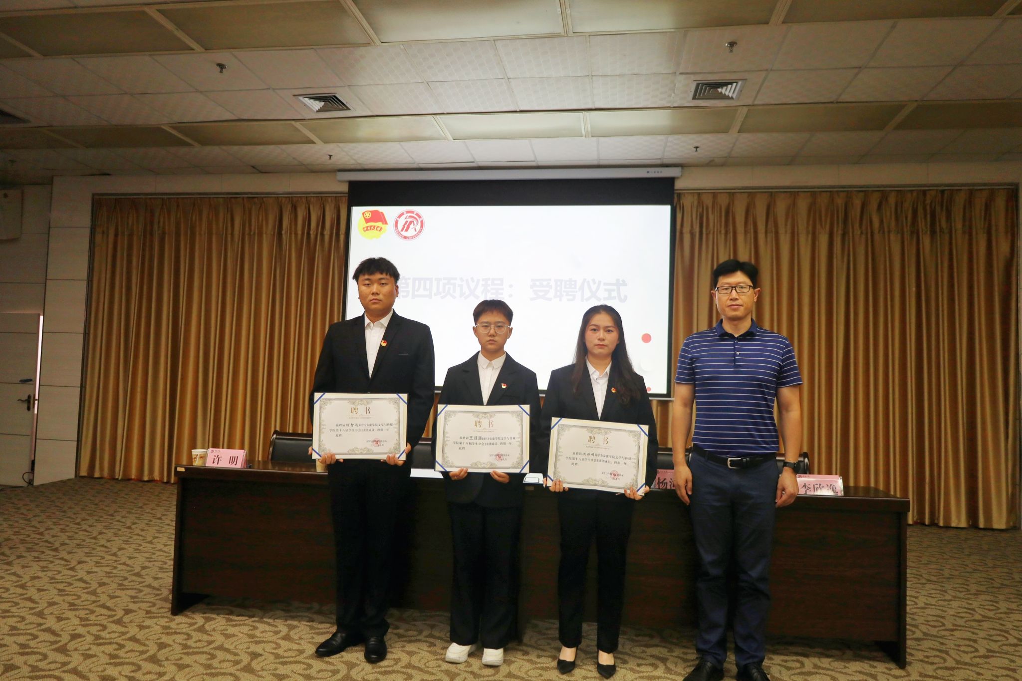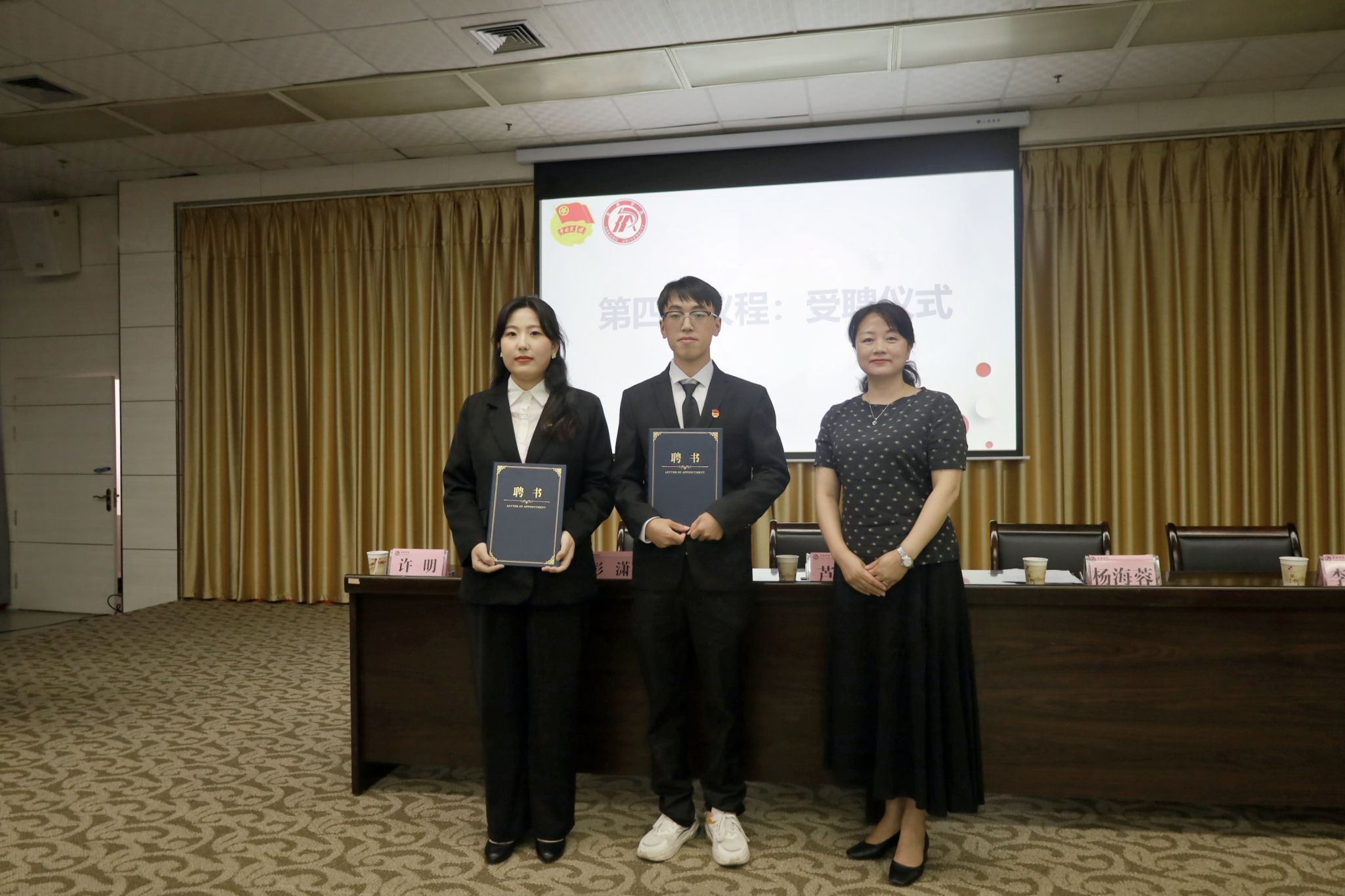 彭潇宣读公司第十八届团总支、员工分会人员名单。芦伟、杨海蓉分别为主席团成员、团总支副书记颁发聘书。