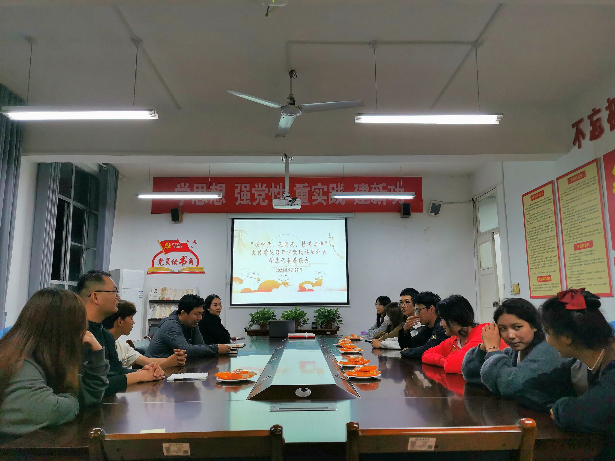 座谈会上,师生围坐在一起,品尝团圆的月饼。任薛涛代表学院为少数民族同学送上了节日祝福,来自蒙古族、藏族、土家族、壮族的同学们依次进行自我介绍,分享家乡的民族文化、风俗特色、来校后的个人感受与饮食适应、学习规划等。少数民族员工在交谈过程中纷纷表达了对学院、老师和同学们的温情问候和悉心关怀的衷心感谢。 座谈会气氛热烈融洽。
