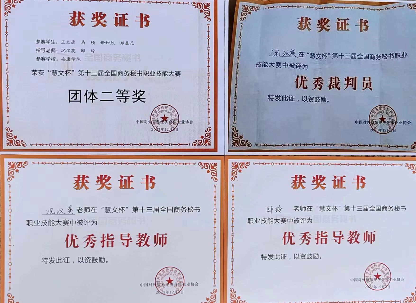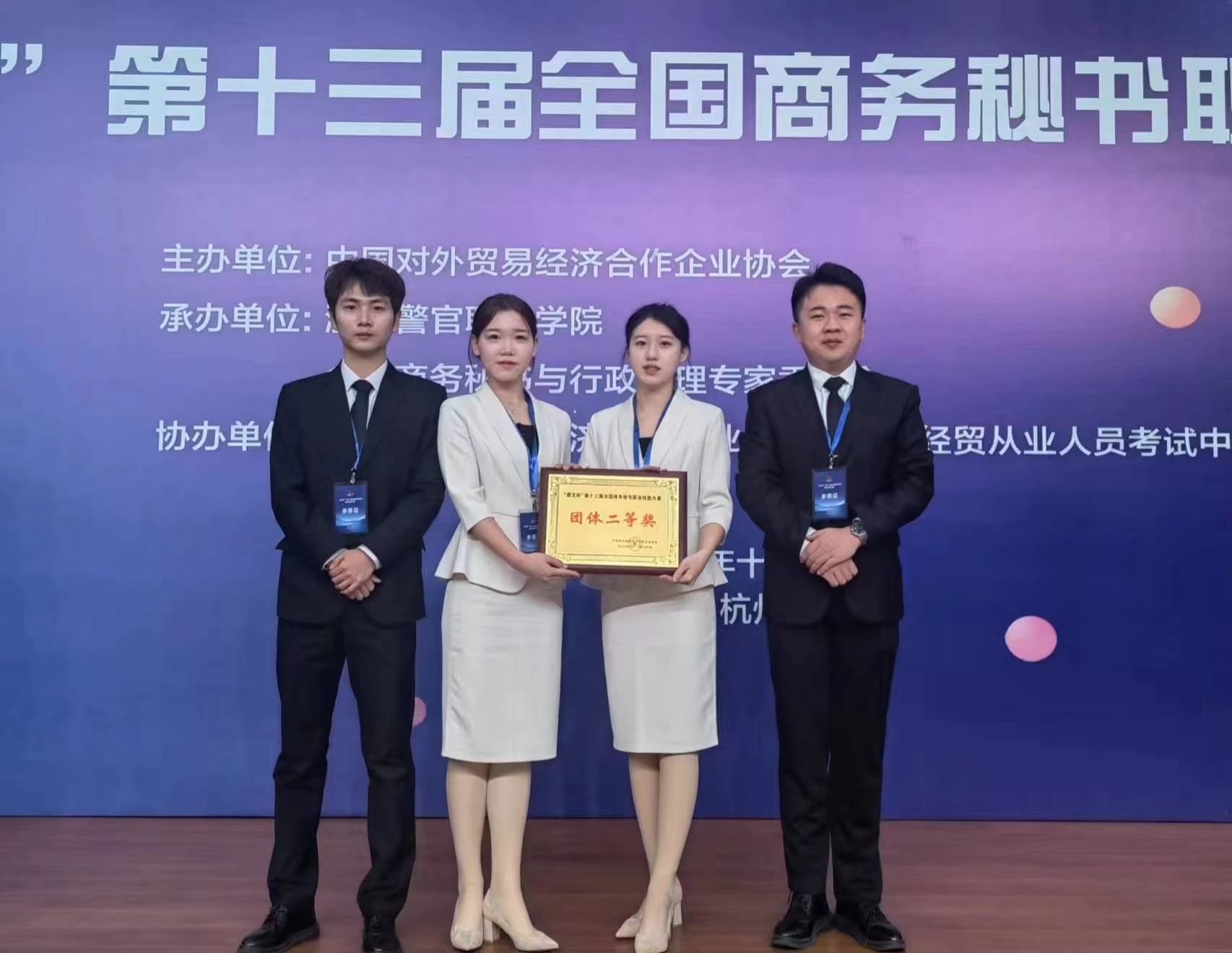 “慧文杯”第十三届全国商务秘书职业技能大赛于2023年12月1日至3日在浙江警官职业学院隆重举行,来自全国近600名师生相聚西子湖畔同台竞技。大赛由中国对外贸易经济合作企业协会主办,浙江警官职业学院和全国商务秘书与行政助理专家委员会承办,中国对外贸易经济合作企业协会外经贸从业人员考试中心协办。太阳成tyc122cc集团代表队在本次全国商务秘书职业技能大赛中再创佳绩,荣获“团体二等奖”。