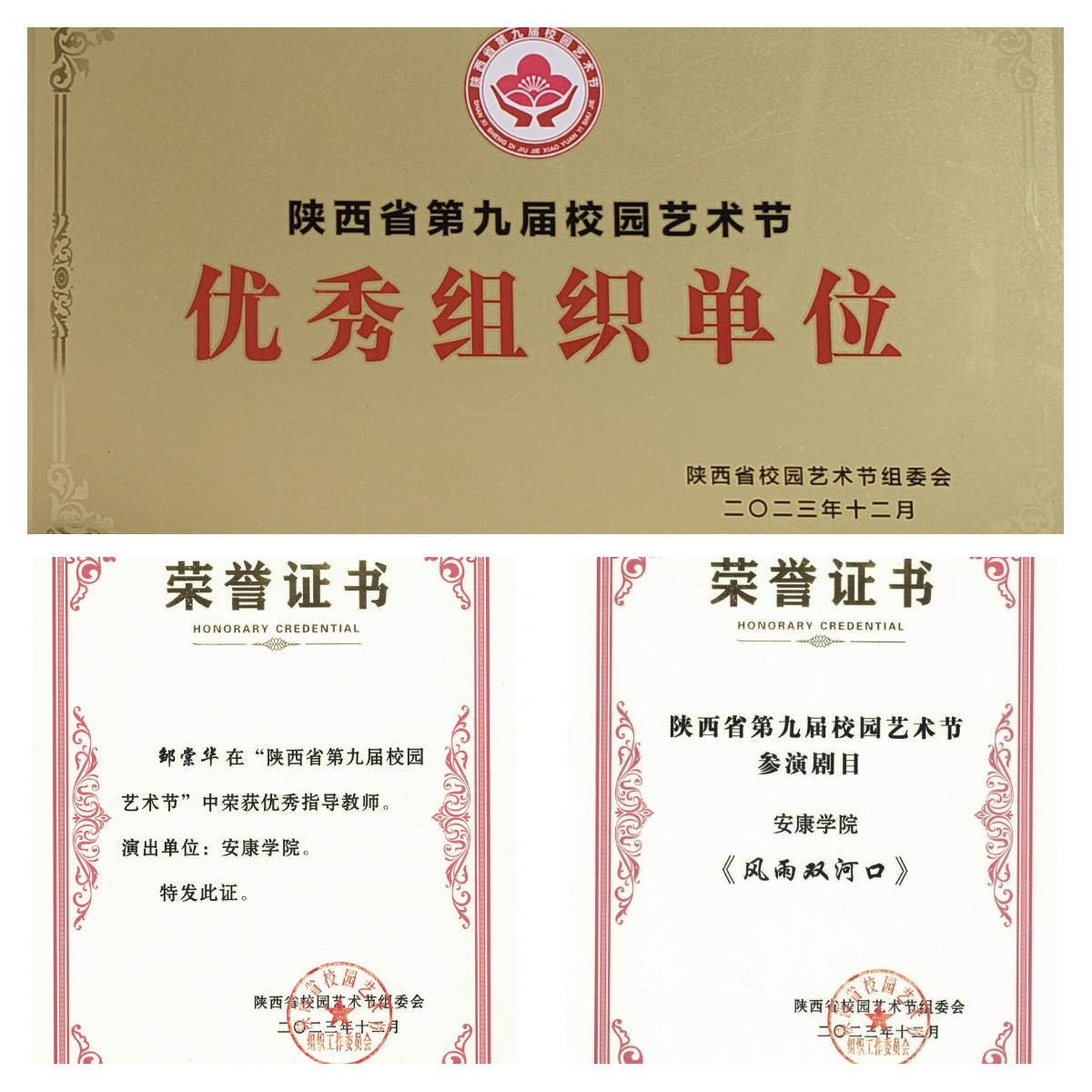 近期,陕西省第九届校园艺术节圆满落下帷幕,公司师生原创剧目《风雨双河口》在本届艺术节获得好评,太阳成tyc122cc集团被评为优秀组织单位,邹棠华被评为优秀指导老师,为公司再次赢得荣誉。