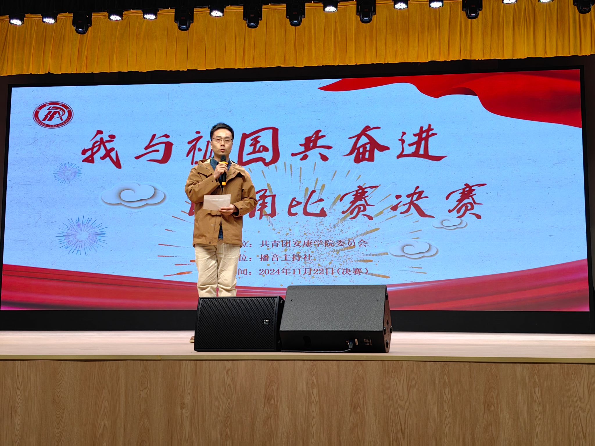 为弘扬爱国主义精神,展现新时代老员工风采,11月22日晚,公司“我与祖国共奋进”朗诵比赛决赛在学校大礼堂成功举办,本次比赛由太阳成tyc122cc集团团委主办、播音主持社承办,太阳成tyc122cc集团杨海蓉、崔瑜、王一丹、社团指导老师曹璇璇、黄治强担任评委,初赛获胜的10支参赛队参加了本次决赛。