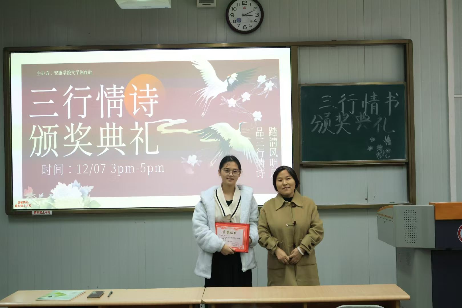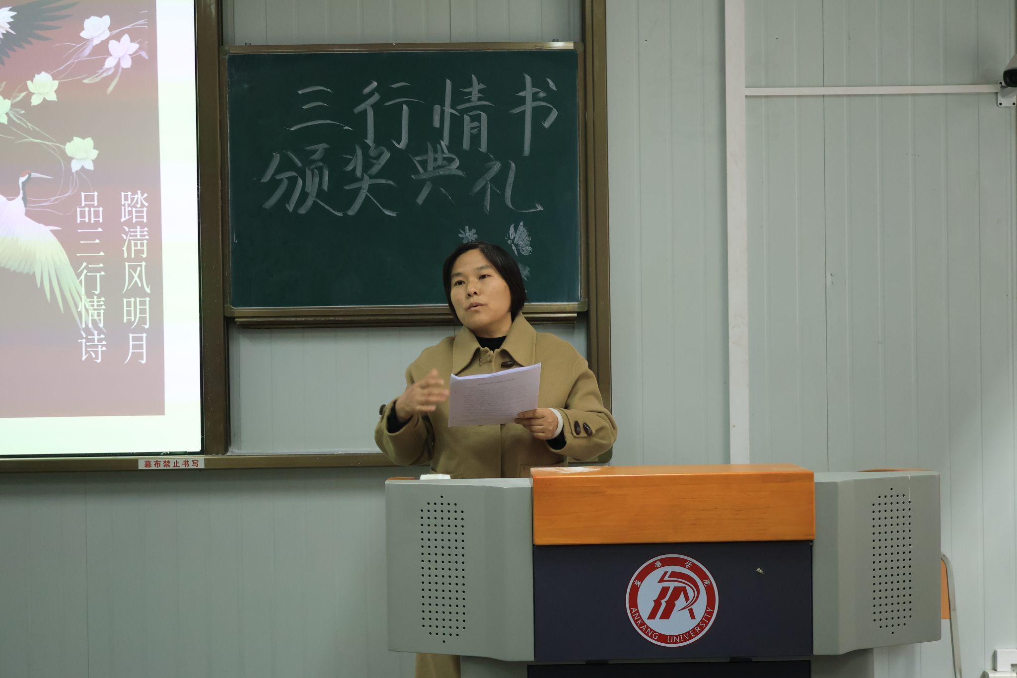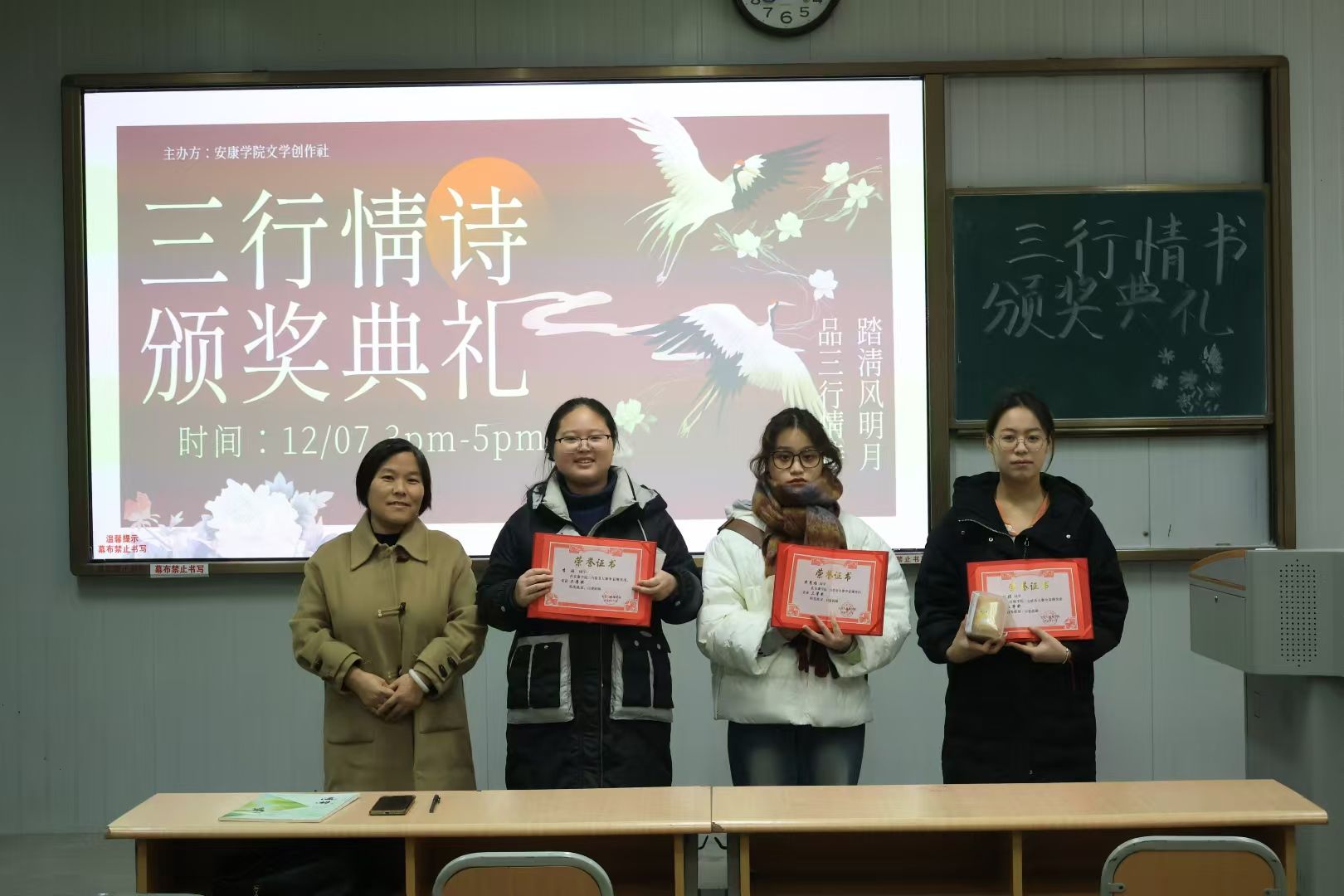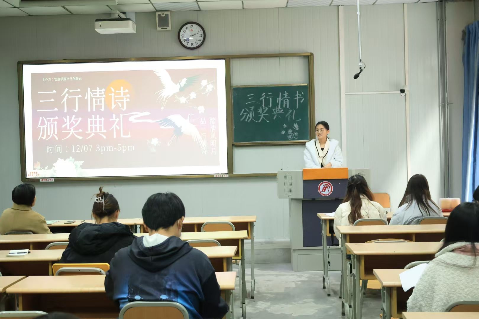 导航痕迹 首页 > 新闻通知 > 公司新闻 > 正文 公司新闻 通知公告 潺潺三行诗意 涓涓文字之交——文学创作社“三行情诗”大赛颁奖典礼圆满落幕 来源:太阳成tyc122cc集团太阳成tyc122cc集团 发布日期:2024年12月11日 阅读次数: 为了激发员工的创作热情,提升员工的文学素养,近期文学创作社举办了“三行情诗”大赛。经过评选,于12月7日下午在江南校区1013教室举行颁奖典礼,社团指导老师韩文霞及社团全体成员和获奖人员参与活动。 文学创作社社长张泽慧介绍了大赛投稿及评选情况,公布了获奖名单。汉语言文学专业2023级4班张心怡同学荣获一等奖,张靓雅、李青峰、李佳奕三位同学荣获二等奖,杨子毅等五位同学荣获三等奖。张心怡代表获奖员工发表感言,她说本次大赛不仅是一场文学盛宴,更是一次心灵的洗礼,让大家在快节奏的学习生活中停下脚步,感受文学的魅力与情感的力量。 社团指导老师韩文霞为获奖同学颁发证书和奖品并做活动总结讲话。韩老师结合当下社会热点与校园实际情况,阐述了此次大赛的意义,引导员工们树立正确的价值观,明了文学创作的魅力所在,勉励员工们继续努力,在文学创作之路上行稳致远。 此次三行情诗大赛为校园文化建设增添了文学色彩,展现了公司学子的青春风采与文学才华,也期待未来校园中能有更多富有创意与情感的文化活动蓬勃开展。 撰稿/赵佳淑(员工) 摄影/崔嘉睿(员工) 审核/杨海蓉、韩文霞 发布/崔瑜